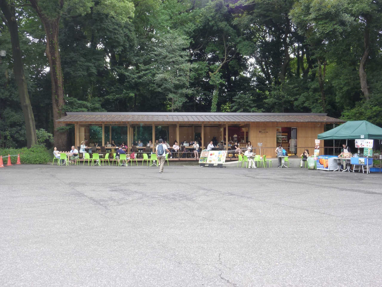 明治神宮に到着すると、大鳥居をくぐる前に、左手にあるカフェです。名前の通り、木目の建物がとても印象的。店内も木目のテーブルや椅子が揃っており、シンプルな素敵な空間を演出しています。黒のテーブルのテラス席もしかkり混んでいました。