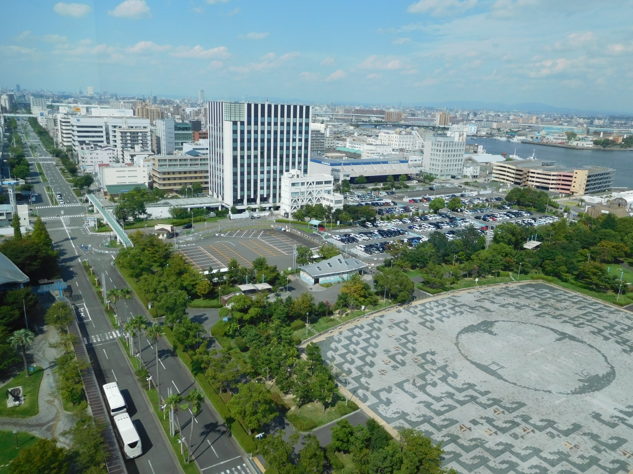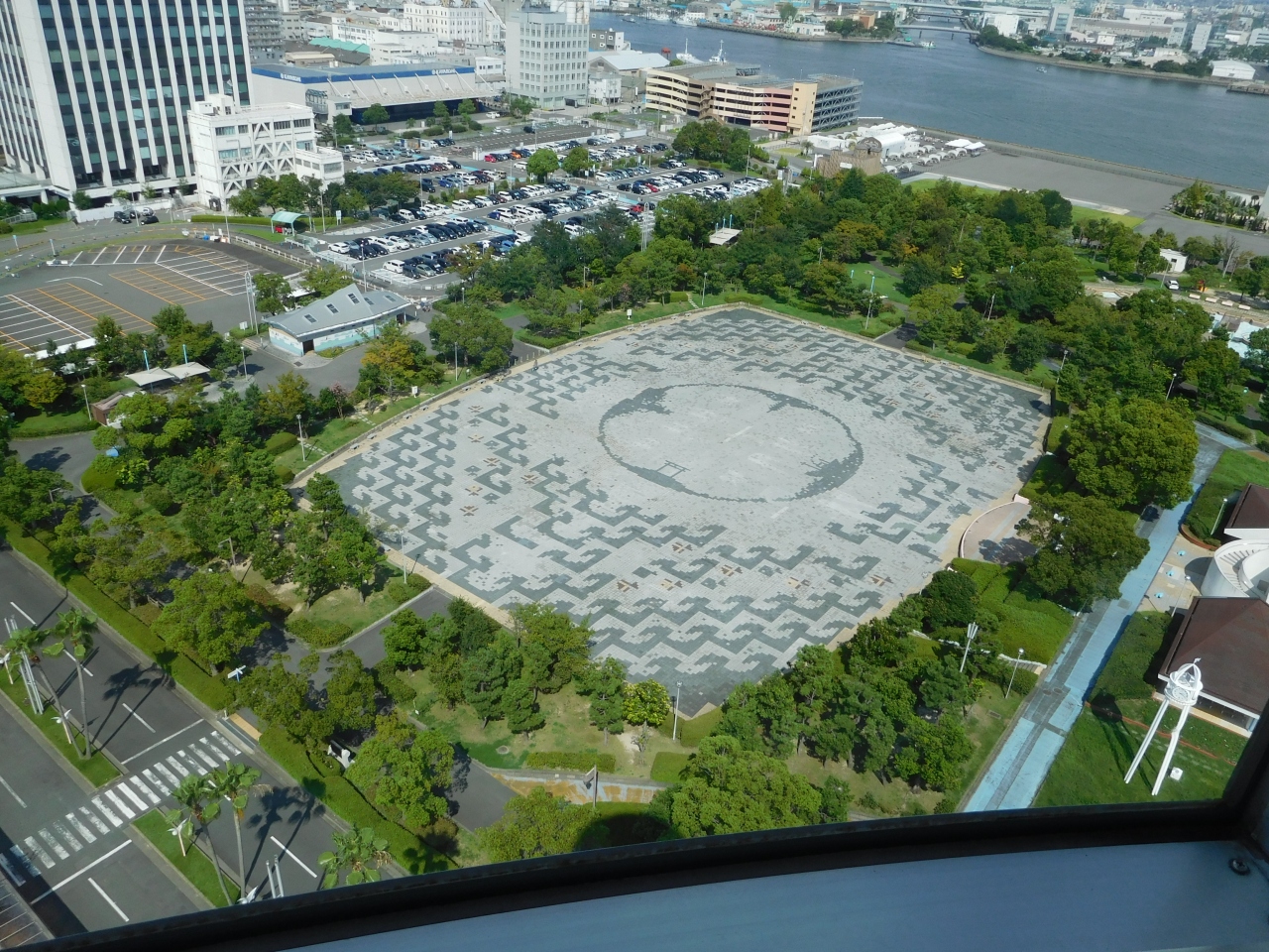 名古屋港ガーデン埠頭の、駐車場近くにある広場です。イベントやフリーマーケットなどにも利用できるようになっていて、小さなステージもありました。ポートビルの展望室から眺めると、広場の全体像が良く見えました。幾何学的なちょっと変わったデザインで、区画を区切りやすくするようになっているのかなと思いました。訪れた時は誰もいなく、がらーんとしていました。