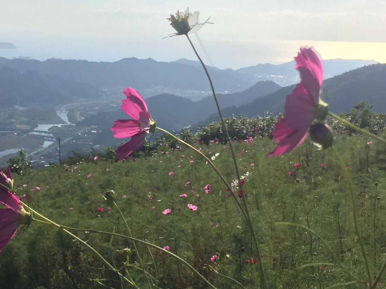 有田川右岸を高速道路をくぐって少し金屋寄りの集落から山に入って30分ほどミカン畠も過ぎてさらに登りきった頂上に開けた斜面にコスモスが咲き乱れる眼下に有田川沿いの町から湯浅、広の町を経て太平洋まで見通せる素晴らしく眺望が良い。北側は紀伊水道から淡路島、四国まで見える。
