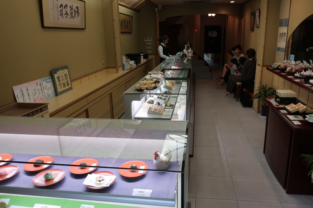 二條寺町にある和菓子のお店です。1階は売店、2階は甘味処になっています。かき氷を食べに行ってきました。朝11時前に行ってみると1階の売り場まで入店待ちの人で1日目はあきらめ、次の日に甘味処が開く10時に行くとすんなりと入店できました。それもそのはずで、店内は20席ほどしかなく、注文してべ終わるのに3,40分かかるのは当たり前です。