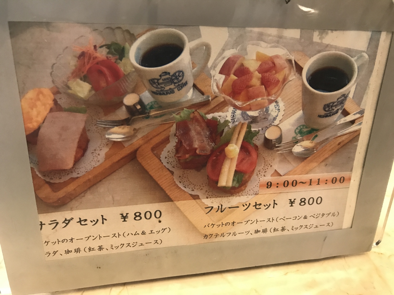 どちらも800円で、バケットのトーストサンドと珈琲か紅茶かミックスジュースの飲み物、