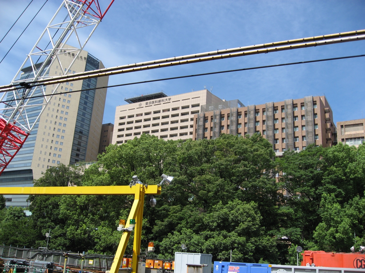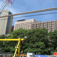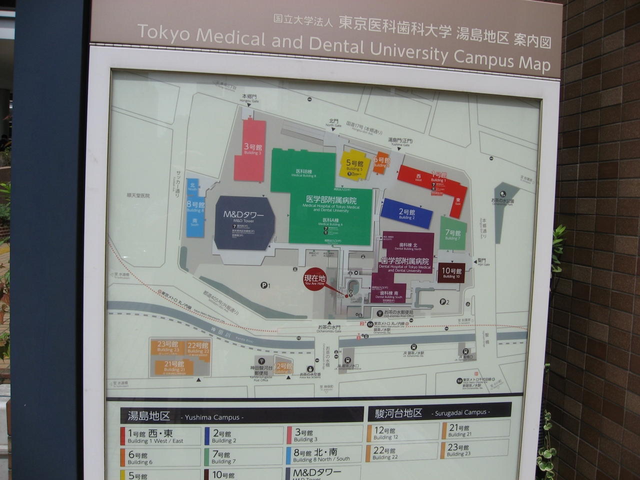 御茶ノ水駅ホームから病院が見えます、入口に行くには階段で登りますが、坂道・エレベーターとあります。