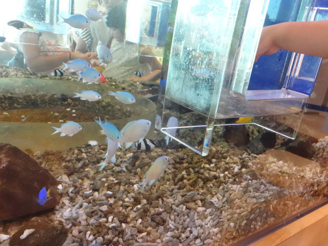 綺麗な水槽ができ、さかなにえさをあげることができます。寄ってくるカラフルな魚を見るのが大好きな娘たち。ここに来るたびにえさをあげています。