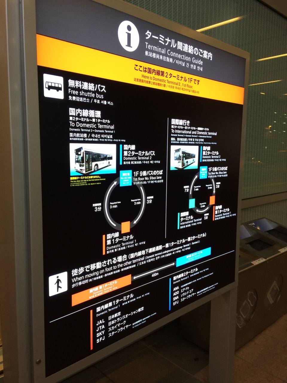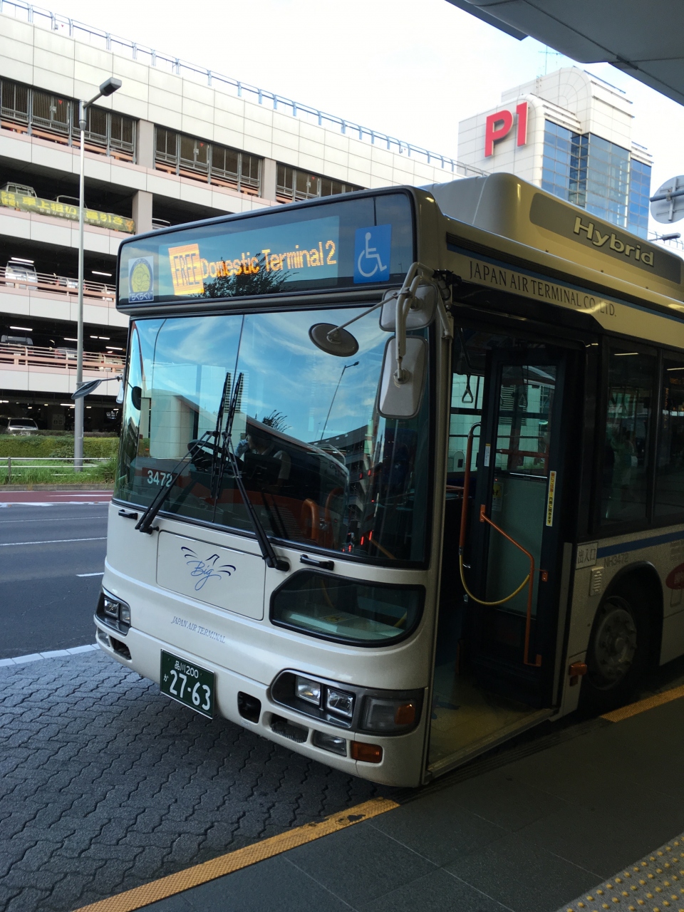 3つターミナルがある羽田空港の連絡バスです。この連絡バスは2ルートあって、国内線ターミナルを行き来するもの、国際線ターミナルによるものがありました。本数もそこそこありますし目的地によって使い分けができました。