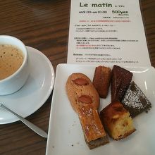朝9時~10時は、ドリンク(コーヒー、540円)をオーダーすると、パンや焼き菓子を無料でいただくことができます。