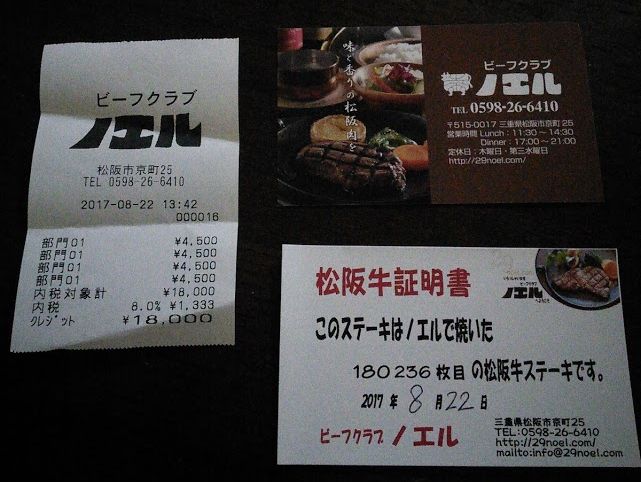 ランチで松阪牛のステーキを食べようと8月平日の12時半頃に到着した。店舗裏に10台弱の駐車場があり、一番道路に近い所が空いていてすぐに入れることができた。店舗の二階に上がり、壁に張り出してある紙に名前と人数を書いてエントリーする。私の前に一人だけ待っていたが、さほど待たないうちに案内されて店舗に入っていった。これは結構早いかも、と思ったが、店の人が出てきて「電話された方ですか?」ときく。「いいえ」と答える。店のドアの反対側に二人掛けのソファが置いてあり、そこに座って待つ。家族は車で待っていた。しばらく待っているとその電話した人たちがやってきて、先に店舗に入った。かなり待っていると店の人がまた出てきて「もうすぐです」と言ってくれたが、そこへ予約した人たちが来たので、「ごめんなさい、まだ予約がありました」と言われた。結局30分待ってようやく店の中に案内された。カウンタも含めて31席あるそうだ。4人全員が「松阪牛マスターの気まぐれステーキランチ」4500円を注文、ステーキの焼き方は黙っているとミディアムレアになるらしい。義母の分だけミディアムでお願いした。まず最初に冷製のコーンポタージュスープが来た。よく冷えていて暑い日に美味しい。冷えてはいるが味がしっかりとしている。続いて木製の皿にサラダがたっぷりと盛られてきた。ドレッシングも美味しい。今日の肉の部位はどこですか?と聞いたら、部位は日替わりではなく、都度異なるのだそうだ。私たちは男二人、女二人だったが、男にロースを、女にフィレを持ってきてくれた。ただしフィレと言ってもよく見るような丸い形ではなかった。ミディアムレアの焼き加減は丁度良かったし、義母のミディアムも結構赤い部分が残っていた。肉は100g程度だろうか?小ぶりだが、油の味が甘くて旨い。口に入れると噛むまでもなくとても柔らかだった。肉だけでなく、付け合せのピーマン、ニンジン、キャラメリゼしたジャガイモもちゃんと調理されていておいしい。御飯も美味しかったし、最後に持ってきてくれたアイスコーヒーも旨かった。単にステーキを安く出していると言うだけでなく、全部の仕事が丁寧だった。ウェイトレスの女性も気さくにおしゃべりしてくれて楽しかった。4500円は税込みだった。クレジットカードが使えた。支払いを済ますと4人分の「松阪牛証明書」カードをくれた。私が食したのはこのお店で180,236枚目の松阪牛ステーキだそうだ。この気まぐれステーキはごく最近まで3500円だったようだ。1万円でほぼ三枚食べられるのと、二枚しか食べられないのでは全然違う。勿論4500円でもまだ通常の半額近いのだろうけど。行くなら予約していくのがお勧めである。今度は誰か運転手を連れて行ってワインと共に松阪牛ステーキを味わいたい。