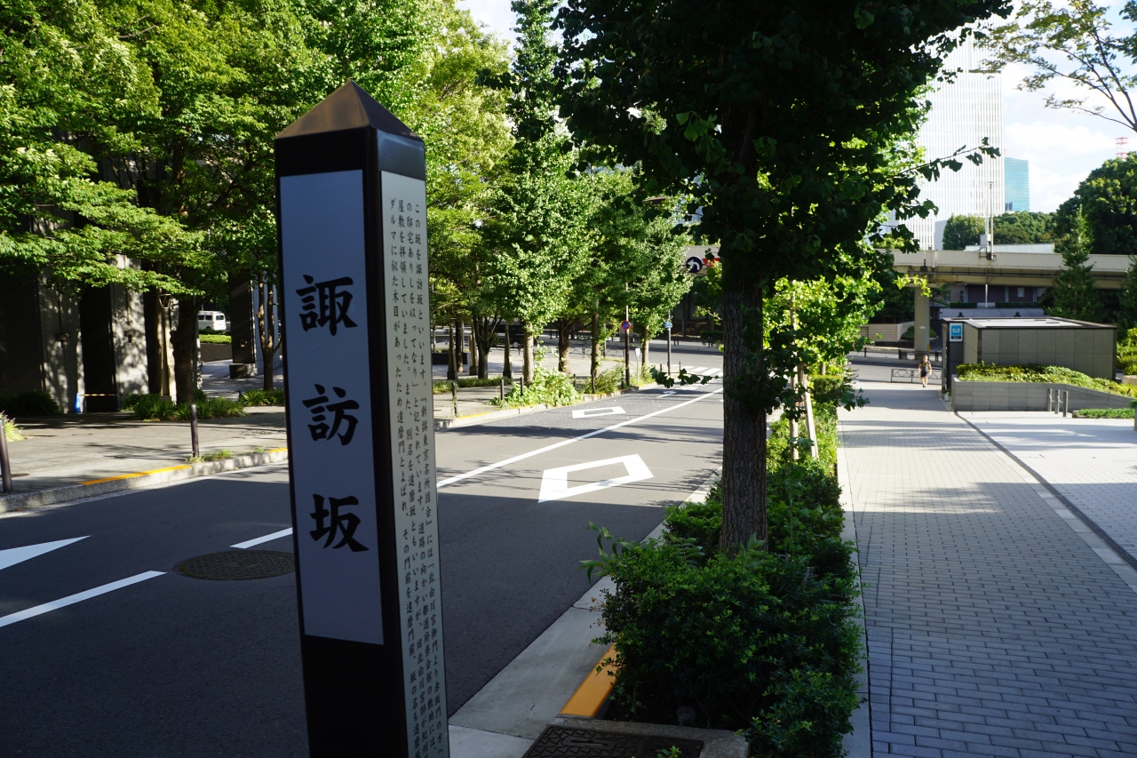 坂自体はなだらかだし、特にどうということはないでしょう。説明には、北白川宮御門前から赤坂門へ下る坂。諏訪氏の邸宅があったとあって、つまり、これは明治期以降の街のことを言っているようです。