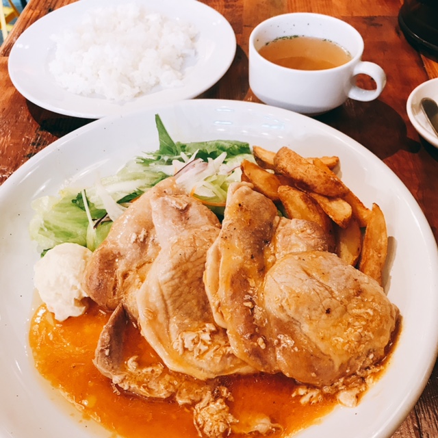 パークソテーになぜかフライドポテトがセットでお皿にのっているのは面白いけど。