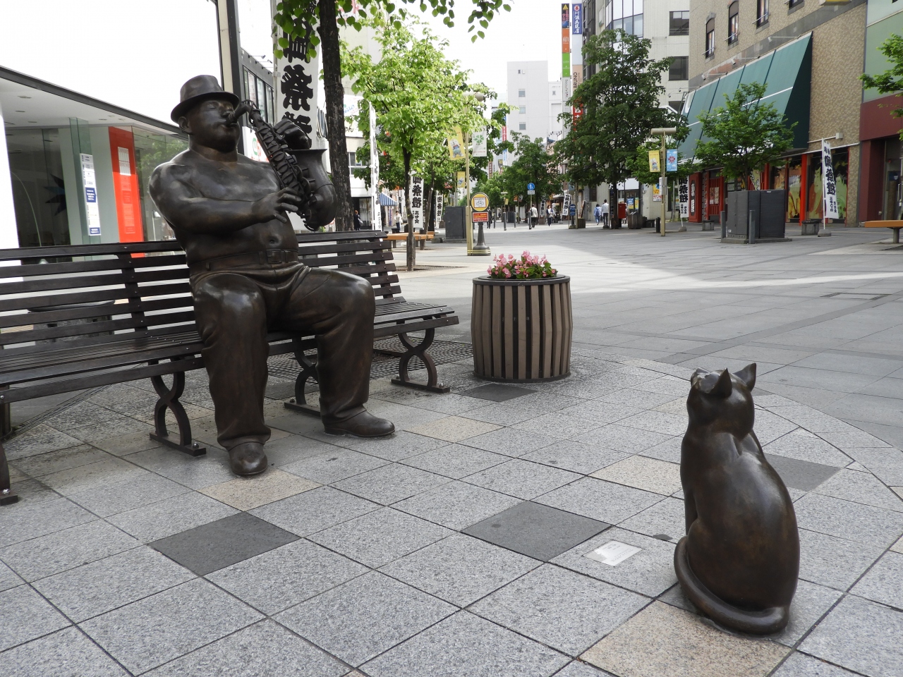 初夏に所用で旭川を訪れた折、ホテルを出て駅に向かって買物公園を歩いていると、太った男がベンチに座ってサキソホンを吹いているブロンズ像を見つけました。その前には、お座りして演奏に聴いている猫のブロンズ像もあり、微笑ましい光景でした。尚、サキソホン吹きの右隣は空いているので、そこに座ると記念写真を撮ることができます。