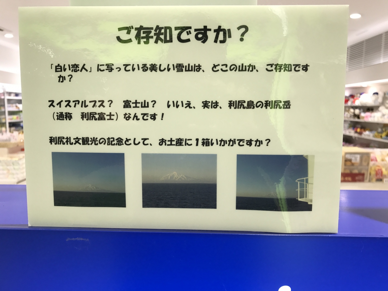 北海道の定番土産である「白い恋人」もこのお店では、白い恋人のパッケージが利尻富士であることを全面に出して販売されていました。