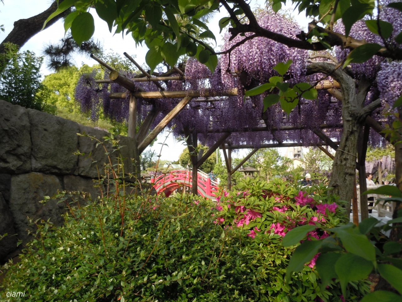 ちょうど藤の花盛りで、赤い橋やスカイツリーとのコラボレーションが楽しめました。