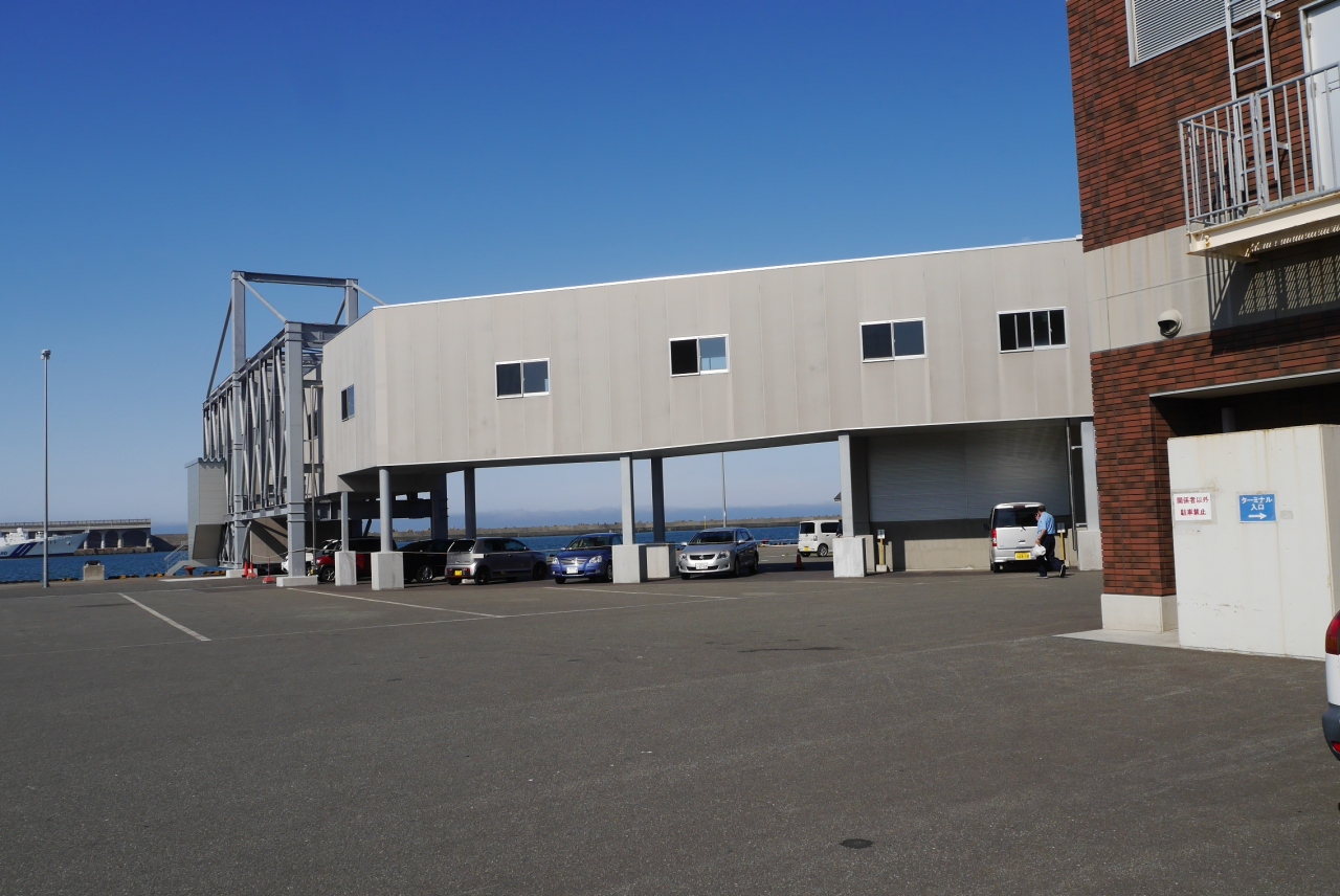 2階の乗船口から船までは専用通路を移動します。対岸に北防波堤ドームがあり、巡視船が停泊している姿を見ながら移動できます。