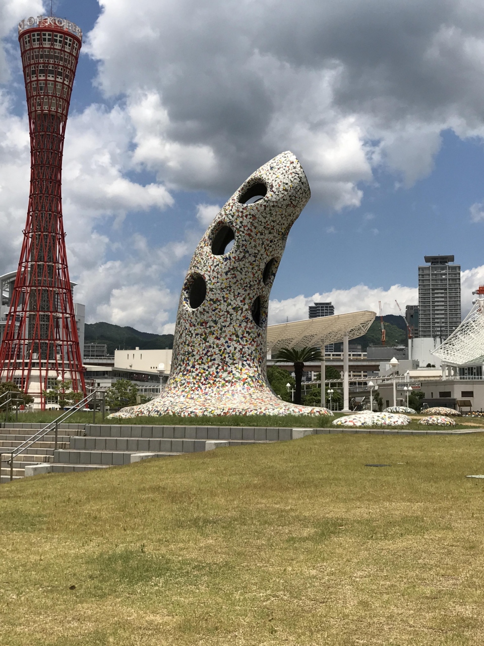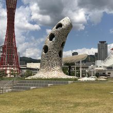 神戸メリケンパークの中にあるスタバのすぐ隣にある巨大なオブジェです。オカリナのような形をしているので目を引きます。曲線の大きな碑に穴が開いていました。1989年に神戸ファッションフェスティバルを記念して作られたそうで、立派な鐘楼だということです。ちなみに鐘はなっていませんでした。