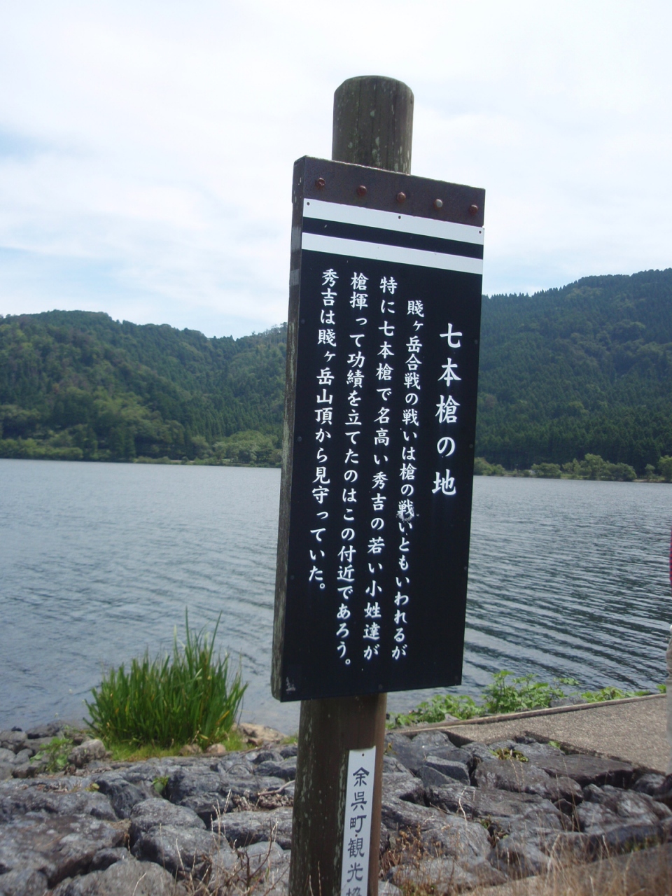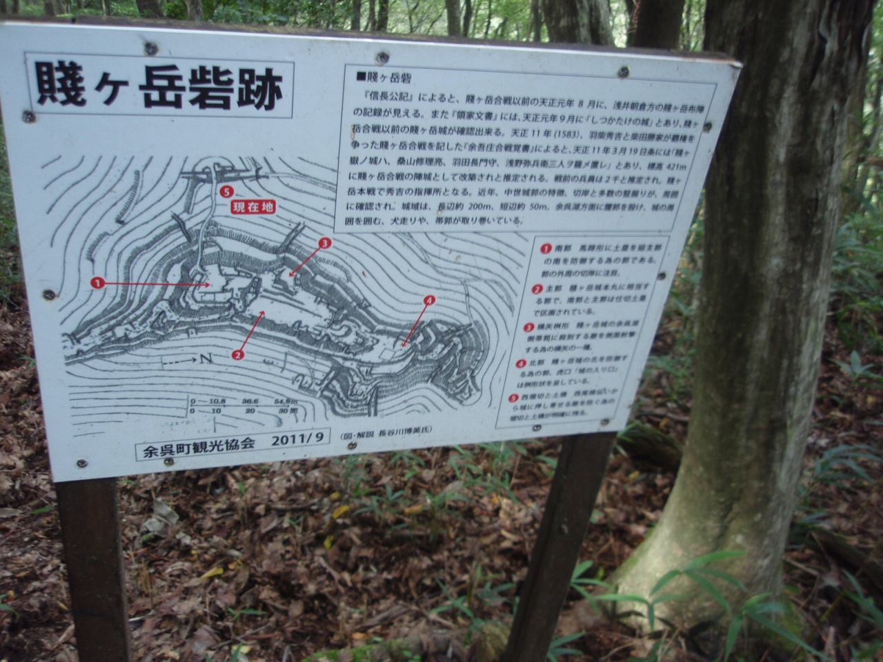 豊臣秀吉と柴田勝家との賤ヶ岳合戦場所で、秀吉軍の指揮所であったところです。余呉駅より歩いて拝郷五左衛門(佐久間軍のしんがりを務め討ち死)の墓、その後、飯浦切通、(大激戦地)、賤ヶ岳砦跡(秀吉軍の指揮所)、大岩山砦(秀吉軍の中川清秀がここで討ち死に、囮の砦とも言われている)、 岩崎山砦入口(秀吉軍の高山右近の陣地)を見ることができました。また遺溝は切通、竪堀がありました。 戦国時代の歴史に興味のある人にとっては絶好の睡涎の場所です。 是非お勧めします