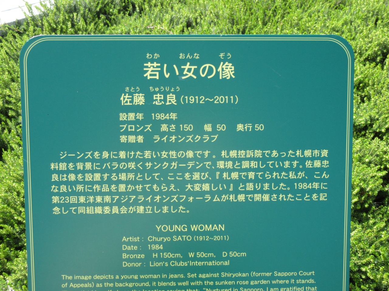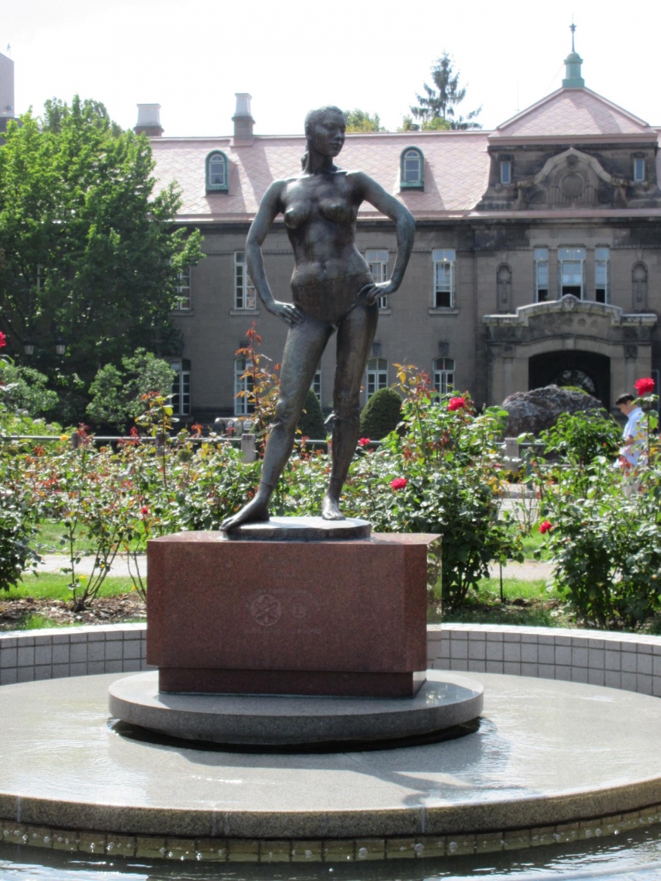 大通り公園の最西端、バラ園のなかになります。佐藤忠良氏の作品で、モデルが娘で女優である佐藤オリエ氏という。恥ずかしながら、オリエ氏は知っていたが佐藤忠良氏という彫刻家は知りませんでした。札幌市資料館の前にたつ像は堂々としておりカッコよかったです。