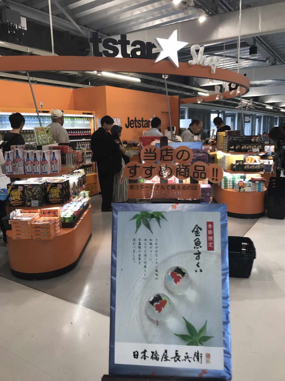 成田空港第三ターミナルのジェットスター搭乗口前にジェットスターのショップがあります。ここでしか買えない日本酒が販売していますが、ジェットスターは事前に購入したアルコール類は機内で飲む事は出来ないので、お土産用ですね。