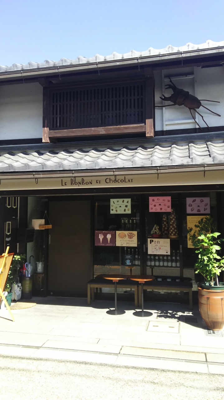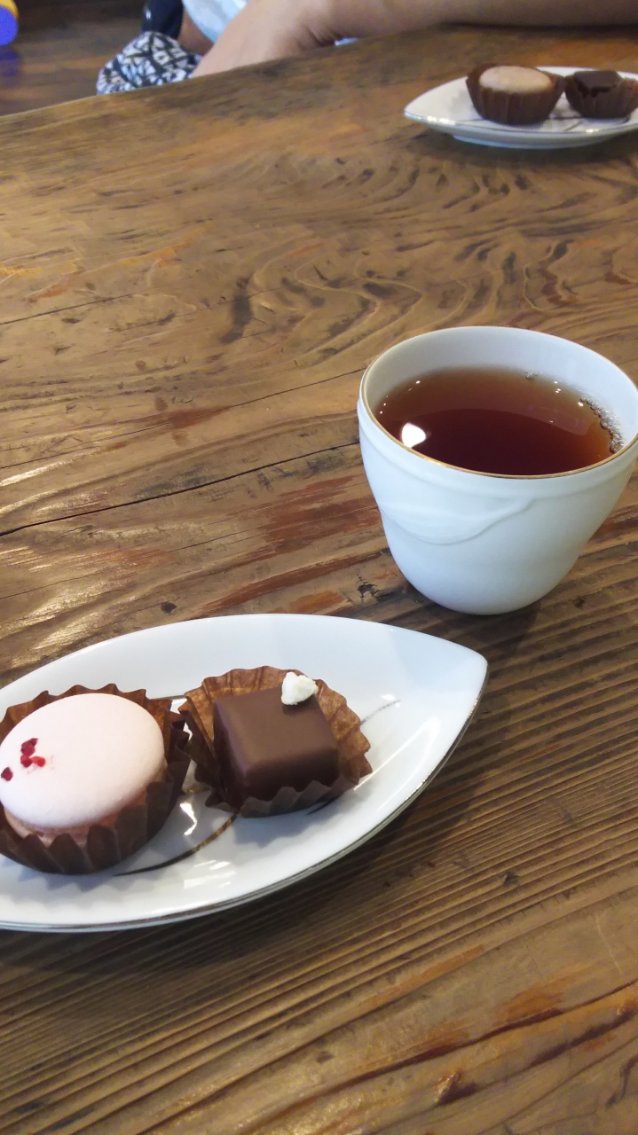 チョコレート専門店のボンボンショコラに入りました。店内は狭いですがテーブルがあり中でも食べられるようになっています。チョコレートが10種類ほど、マカロンとケーキもありました。チョコレートとマカロンをひとつずつ店内で頂きました。紅茶のサービスが嬉しかったです。マカロンは小ぶりでしたが、サクサクしっとりで凄く美味しかったです。