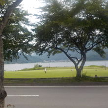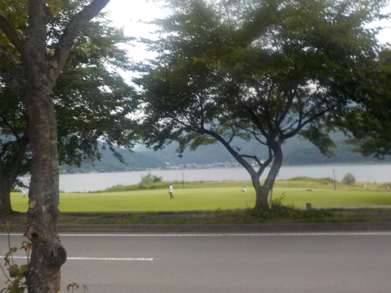 駐車場と河口湖の間が緑地になっていて遊ぶことが出来ます。