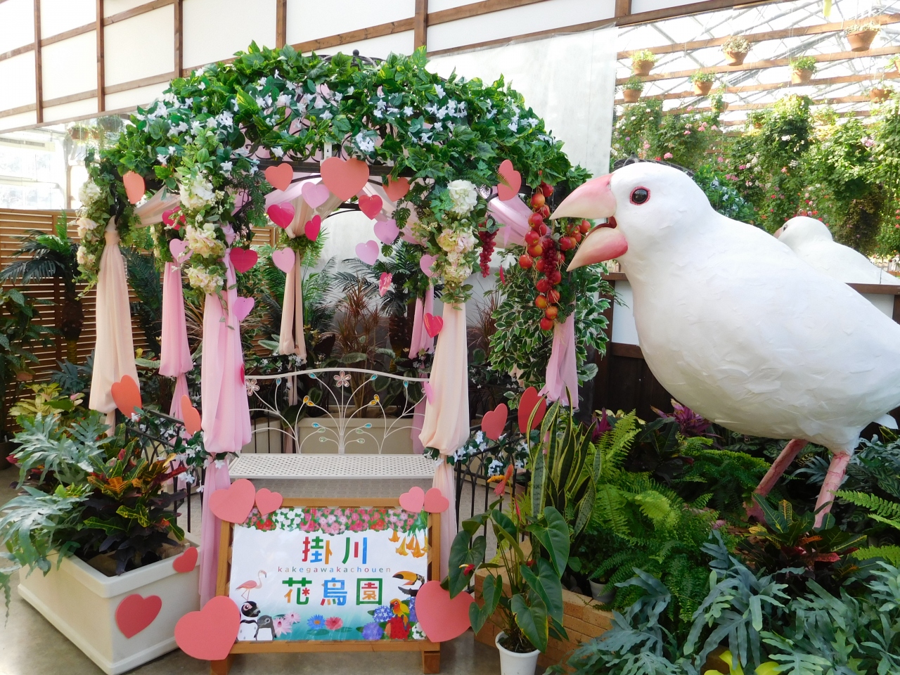 掛川ICや掛川駅からも近く、アクセスの良い場所にある「花と鳥のテーマパーク」です。とても綺麗に整備され、鳥と身近に触れ合う事が出来、大人から子供まで、幅広い世代で楽しむ事の出来る場所です。鳥の種類や数も多く、さまざまなイベントが行われていたり、スタッフさんの手作りのフォトスポットも沢山用意されているので、毎回行くたびに違ったワクワク感が味わえて、とても楽しめます。今回も沢山の鳥たちと触れ合ったり、写真を撮ったりする事が出来、楽しかったです。バレンタインが近かったので、ハートをモチーフにしたデコレーションがあちこちに見られました。自宅からもう少し近い場所にあれば、年間パスポートを購入して通いたいと思える場所です。