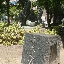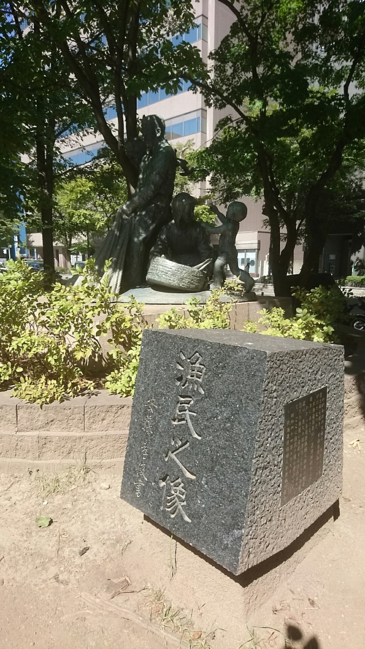 大通公園内にある北海道開拓の功績をたたえる石碑の中でも、この銅像は躍動感があって目立っていました。二人の漁師が力強く網を引き、その傍らには手伝っている夫人と幼子の姿があります。漁協の婦人部が建てた石碑で、北海道開拓を支えた女性たちの力強さを感じさせました。