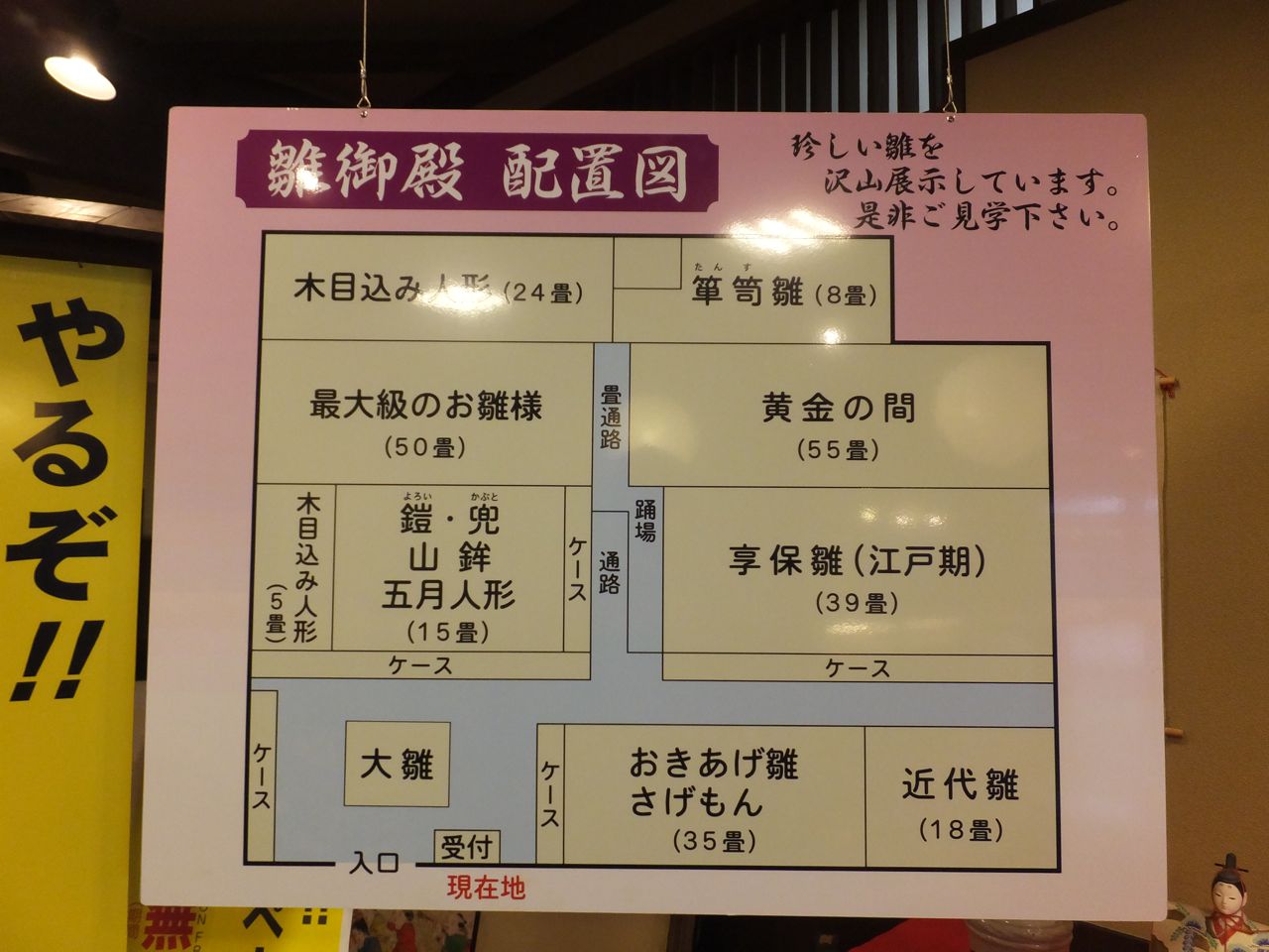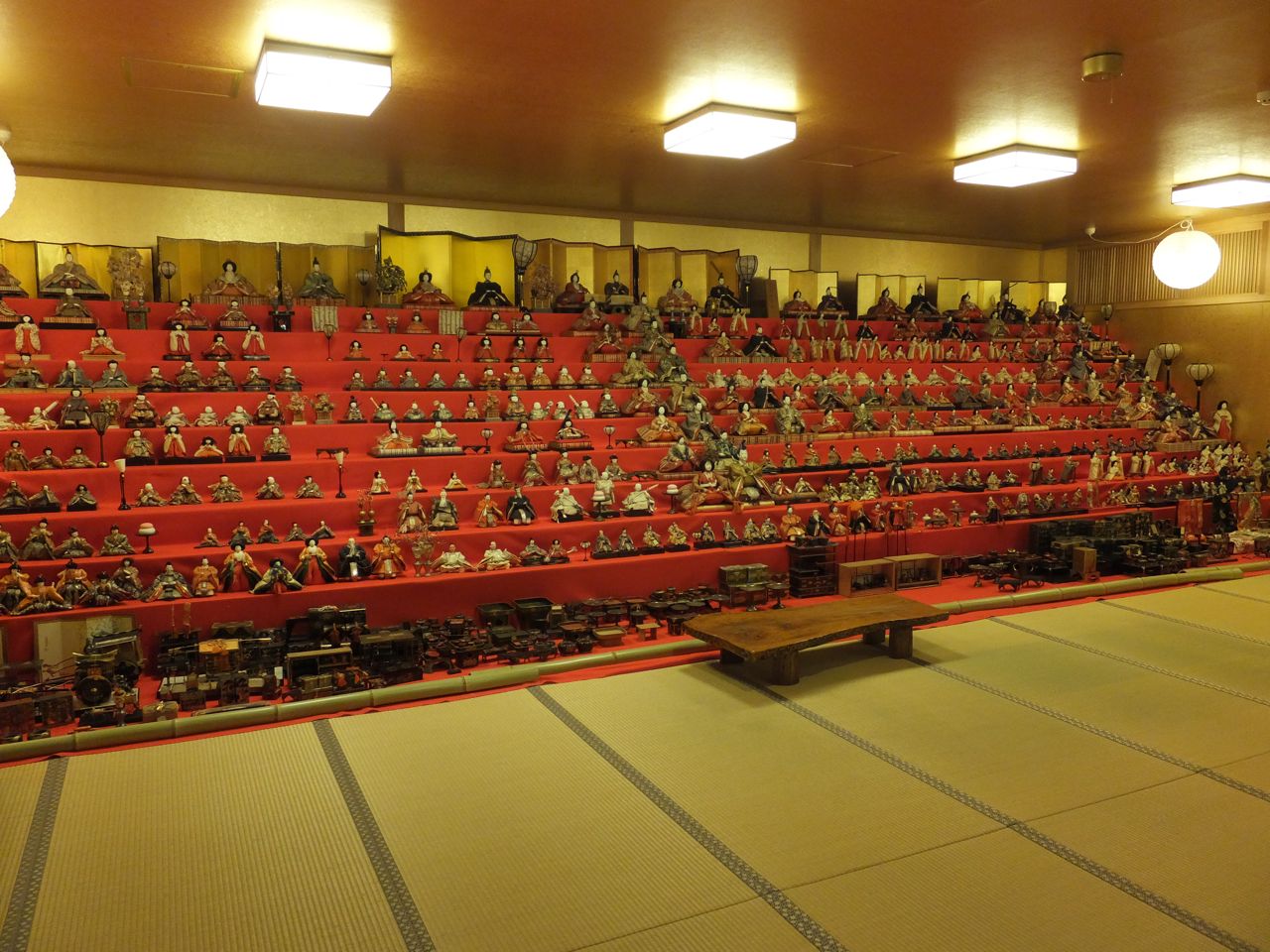 最大で50畳とかの部屋が10室くらいあって、その部屋がそれぞれ時代ごとのおひな様でうめつくされています。壮観です。あまり興味のない人でもこれは感動すると思います。