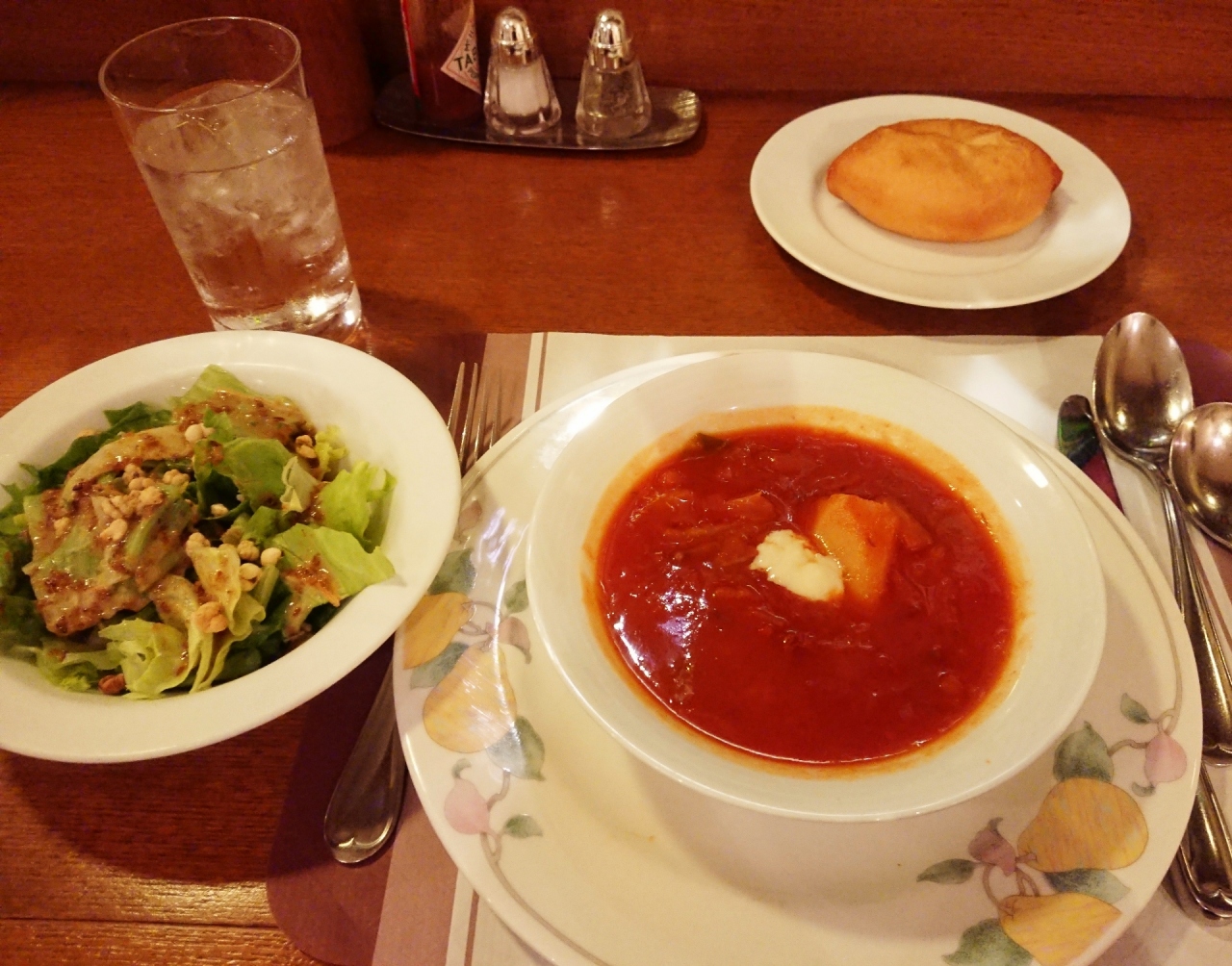 私はボルシチとピロシキ、チーズ焼きハンバーグ、サラダ、ドリンクのセットメニューを注文しました。