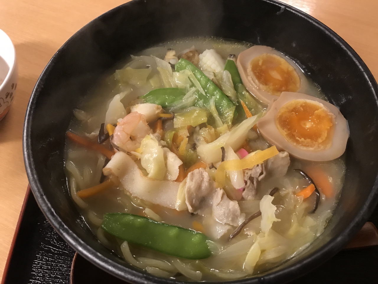 私が頼んだ海鮮ちゃんぽん風ラーメンは、塩ラーメンベースで美味しかったです。
