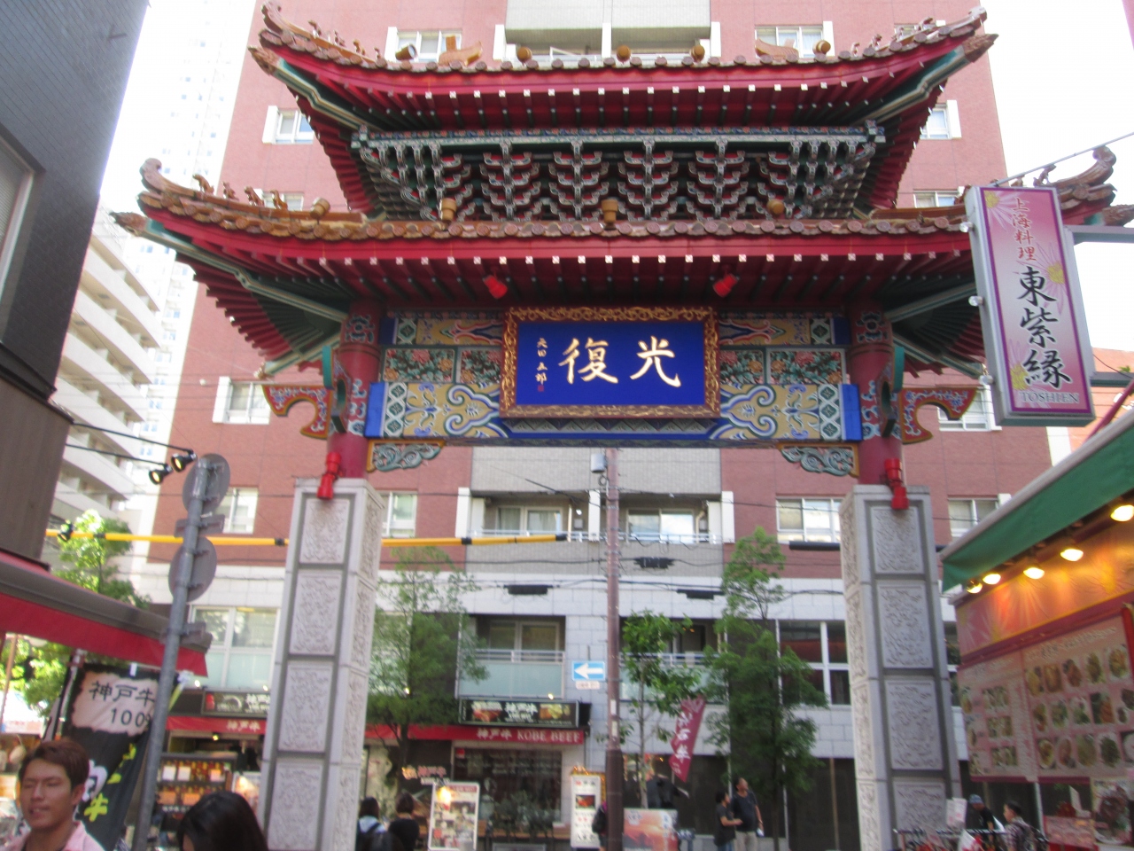 南京町には東西南方向に3つの門がありました。西がこの西安門で朱色の中国っぽい門でした。高さが10m、幅5mぐらいで、阪神淡路大震災からの、復興のシンボルとして建て替えたようです。南京街の外から見ると西安門ですが、内側から見ると上には「光復」の文字がありました。