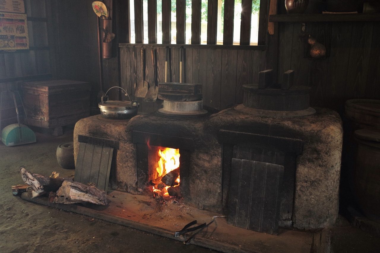 立派な茅拭き屋根を乗せた建築です、土間にある竈では薪が燃えていました。