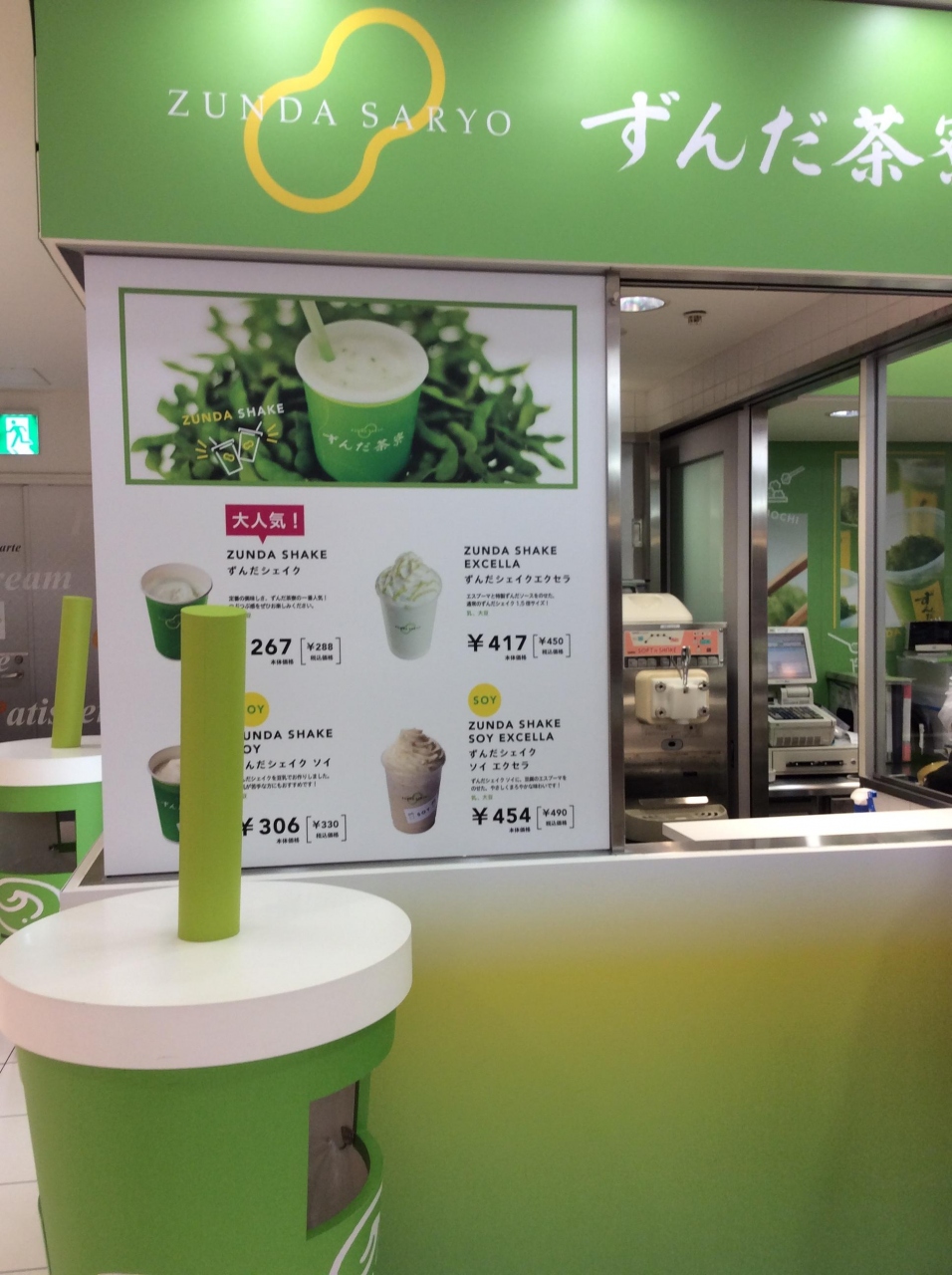 「ずんだ」とは「枝豆」の事で、ずんだモチは以前食べた事があり美味しかったのですが、シェイクは初めてなので買ってみました。ずんだシェイクは枝豆のつぶつぶ食感がとても良くて、クセになるおいしさだと思いました。牛乳の代わりに豆乳を使ったずんだシェイクもありました。枝豆は海外のスーパーでもEdamameで売っていたので、外国人にも人気のようで、アジア系外国人のお客さんもいました。