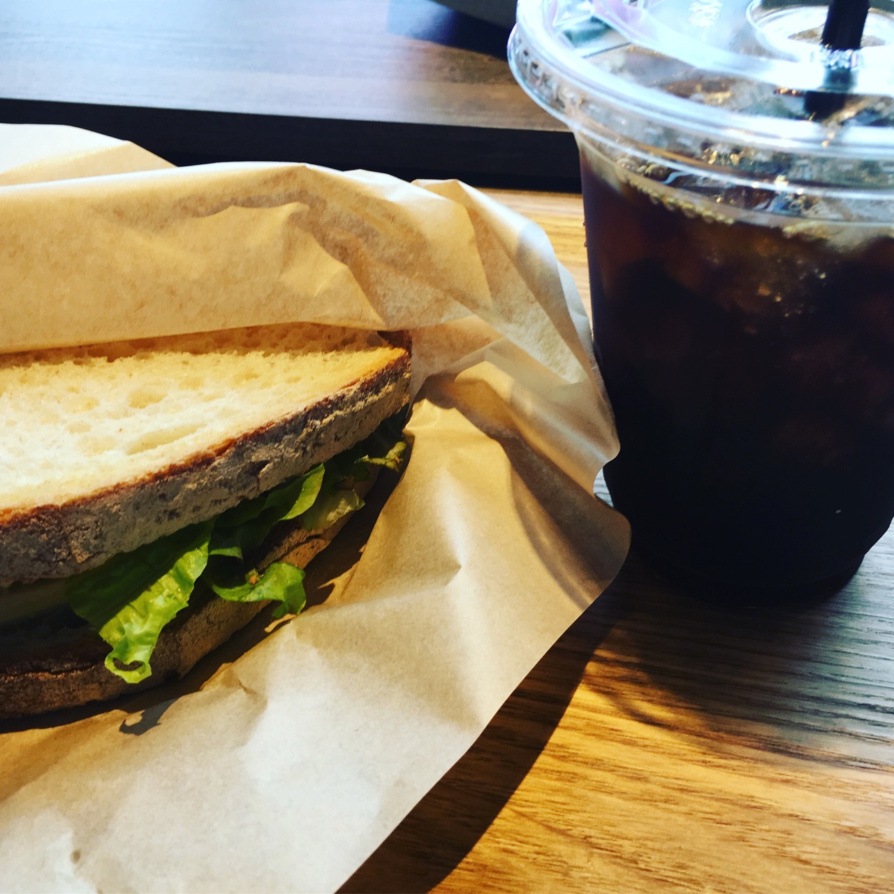 昼時は結構混み合いますが、席さえ見つかれば静かで落ち着いて食べられます。この日は軽めにしたかったのでサンドイッチにしましたが、丼物(ペーパーボウルに入ってきます)もあります。