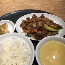 羊肉クミン辛子炒め定食。お肉がたっぷり入って美味しいです。コーンスープと、味玉もついてきました。