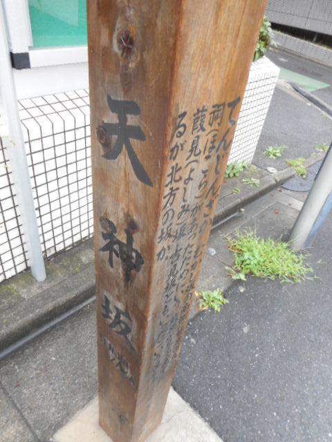 泉岳寺方面から徒歩で散歩中に通りました。東海大学の高輪から少し行ったあたりの坂です。木の案内板がありましたが、それ以外は特に目立ったところもなく、天神坂の名前の由来の天神様も見当たらず。ちょっと急な丸模様のついた坂道といった感じでした。