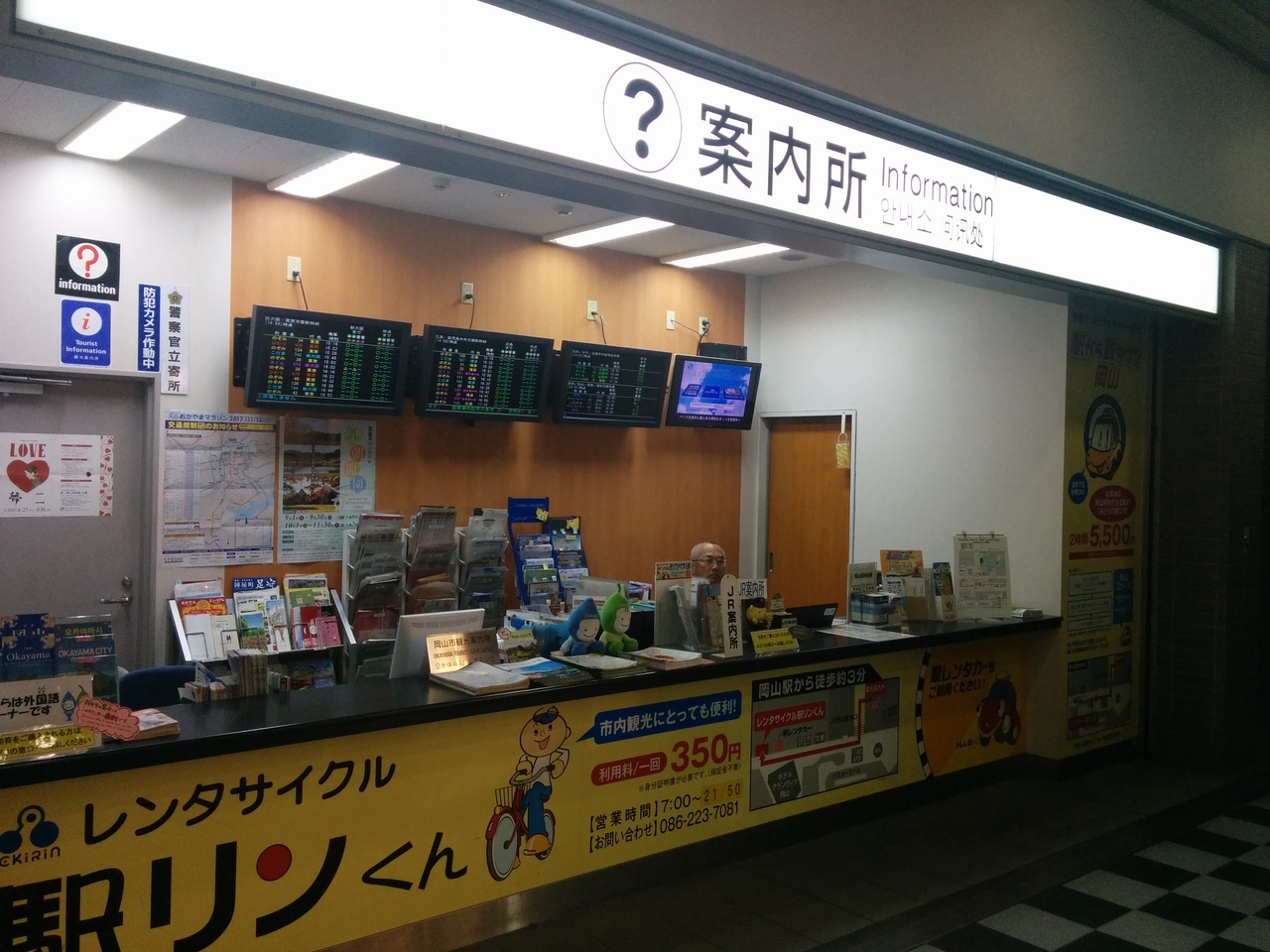 列車を降りた岡山駅で駅員さんに観光案内所を尋ねると駅2階中央改札口左手に案内所があるとのことでしたので改札口を出て左手に行くと案内所がありました。