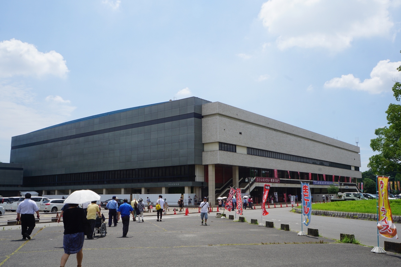 愛知県体育館は、名古屋城の敷地の一角。ちょうど大相撲の巡業がここで行われているということで、大勢のお客さんが詰めかけていました。上りもガンガン立っていましたが、敷地がものすごく広いので、それでも全体としてはまだまだ寂しいくらい。名古屋体育館って、平易な名前ですが、その規模はちょっと半端ではありません。