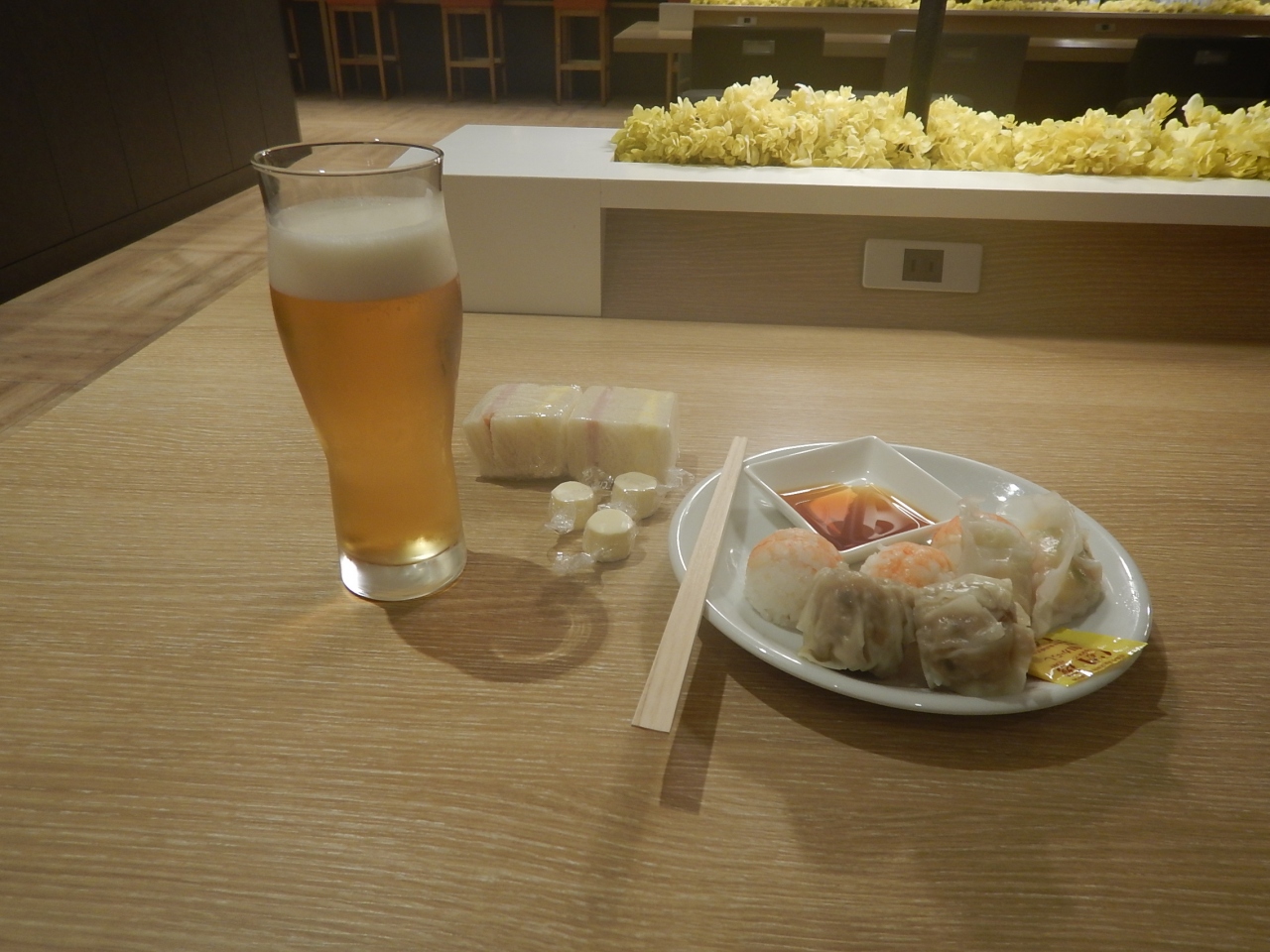 ビール好きの私にとって搭乗前に生ビールを飲めるのは幸せなことだ。写真に写っているのはビールにサンドイッチ、シュウマイ、エビの寿司といったところだ。ビールを数杯飲んで、新聞を読みながら搭乗時刻が来るのを待った。