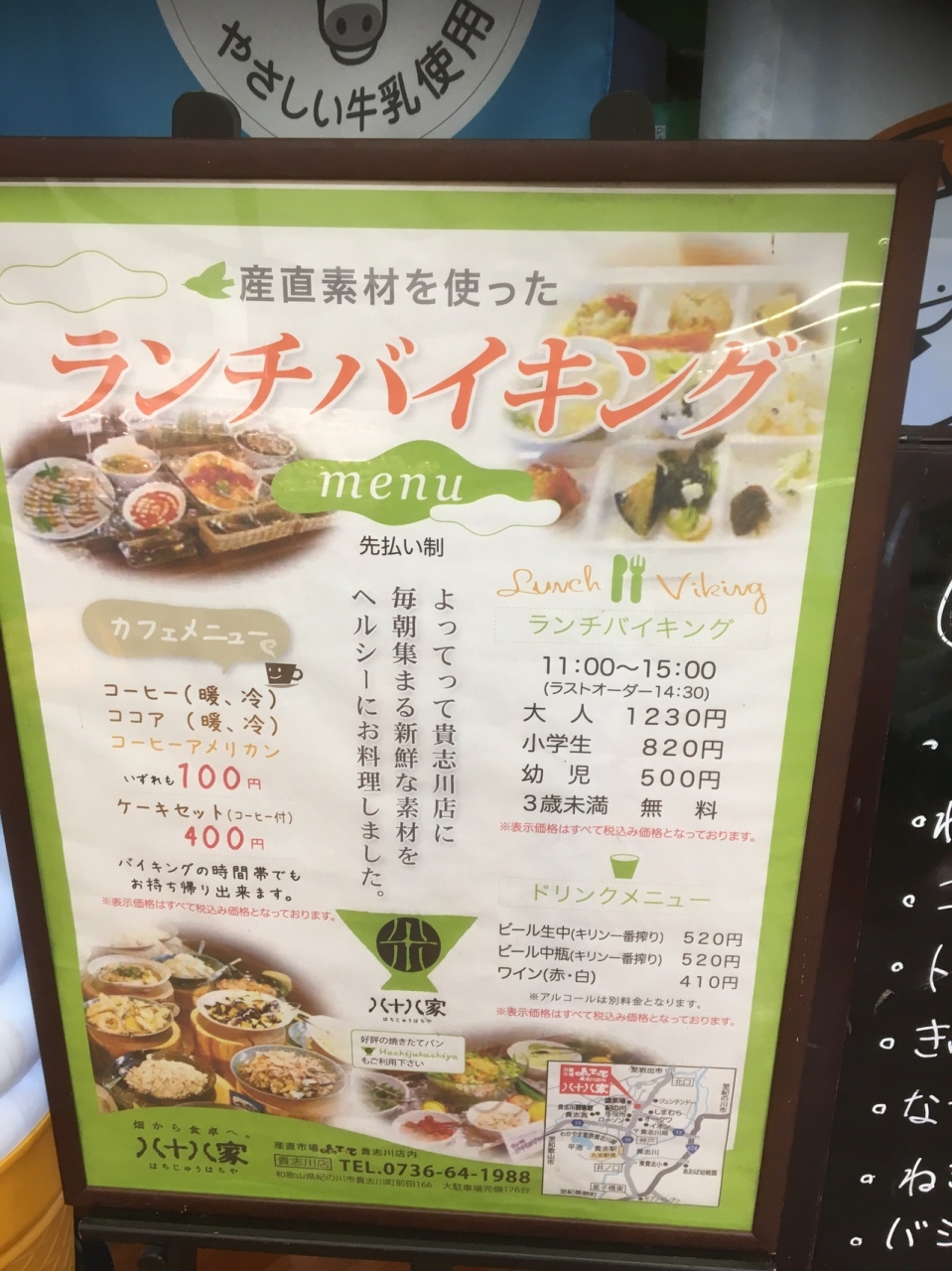 産直市場にあるバイキングレストランです。野菜がいっぱいで安い産直市場内にあり、ランチのバイキングが安くて美味しいです。1230円です。コーヒーも100円で、ビールもありました。その他、有田みかんのソフトクリームもありました。