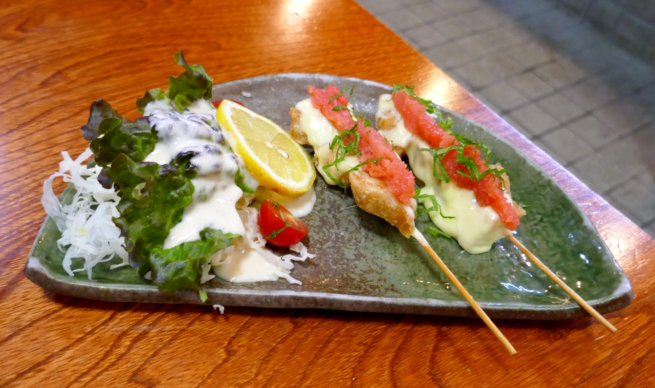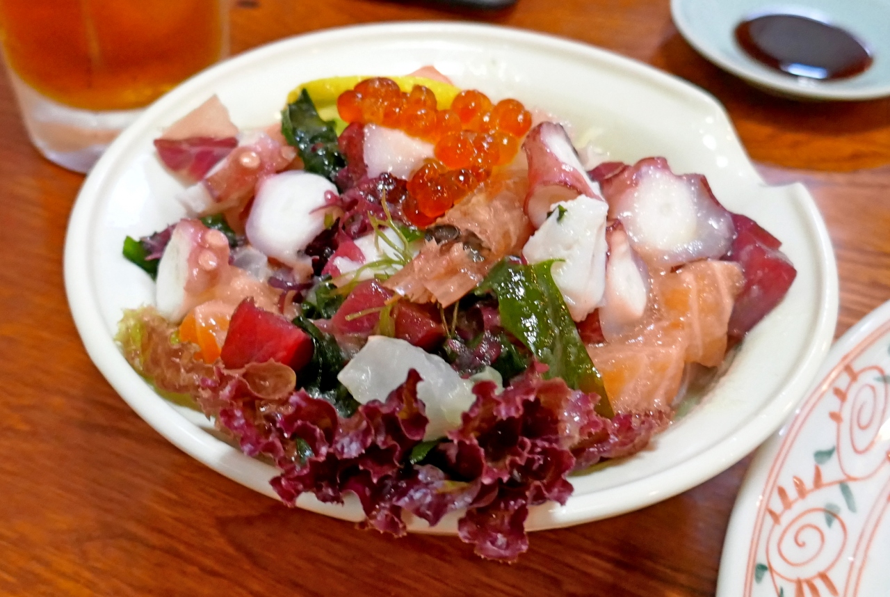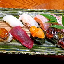 ここの塩たたきは時価だが,高知ではとても親しまれた店とか,たしかに絶品の塩たたきだった.ふつうのたたきよりも薬味だけで食べてさっぱりして美味しい.カツオうまみがよくわかる.あとの料理もなかなかおいしい.まぐろのめんたいチーズなどおもしろい料理もあった.最後に〆の鮨を食べる.日本酒とともに相当酔った