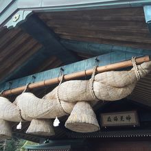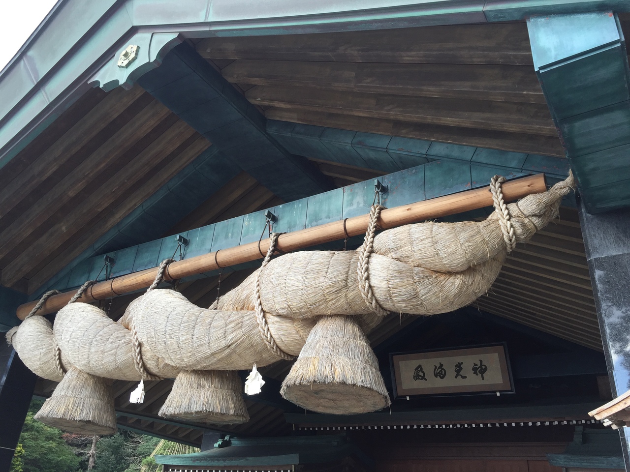 出雲大社神楽殿は、島根県出雲市の、出雲大社の中にありました。大きなしめ縄が目立ちます。この大きなしめ縄を見ると出雲大社に行きたいなぁって感じがします。