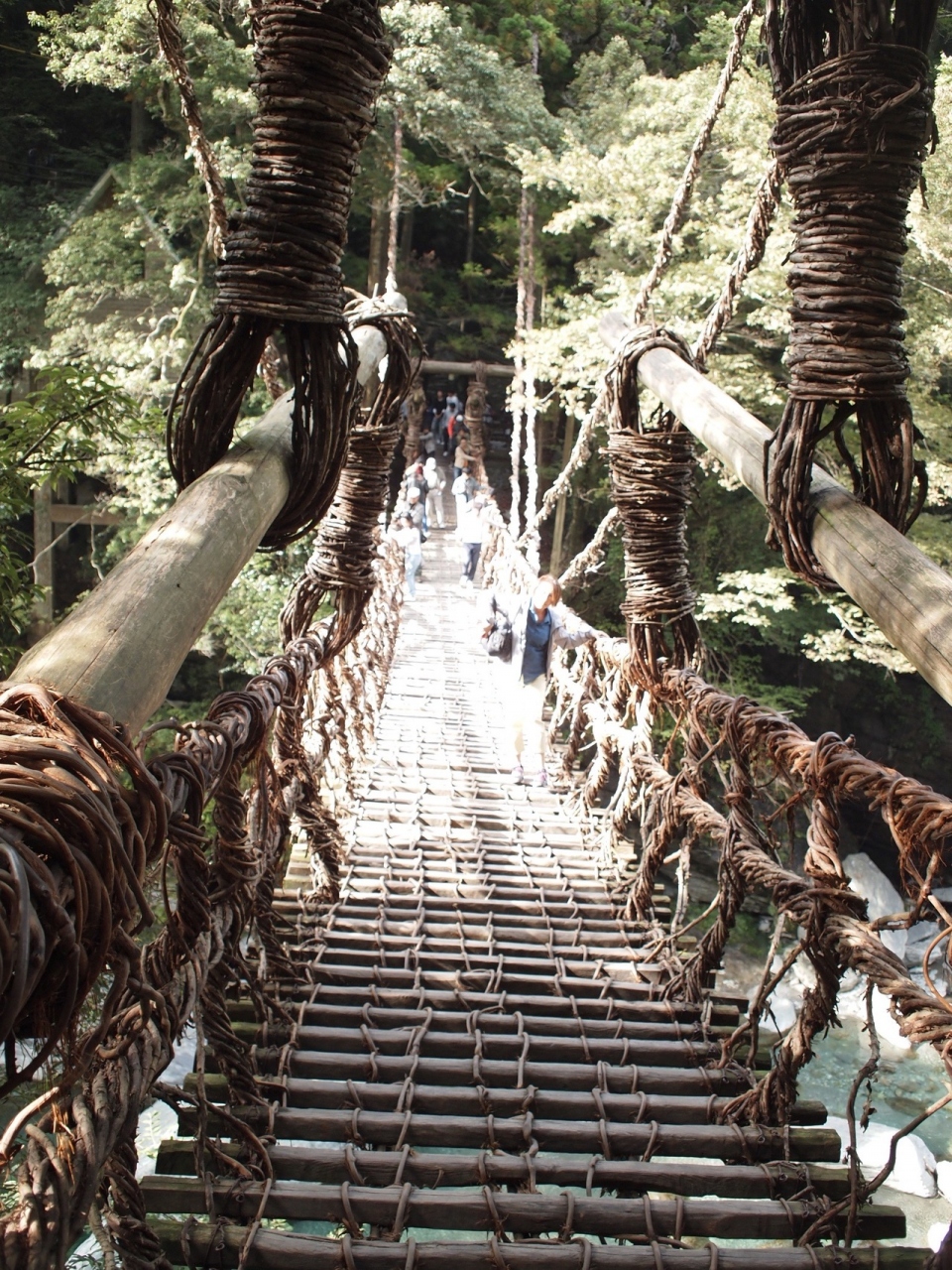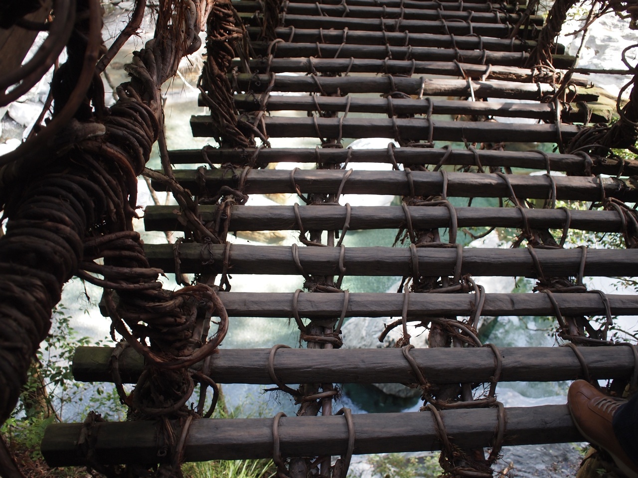 でも実際渡るとなると、下の隙間が大きいので足元を見ないと歩けないのですが、隙間から遥か下の川が見えてかなり恐怖でした。頼りの手摺、というか綱も隙間が大きいので、隙間から落ちるんじゃないかと思うと本当に怖かったです。