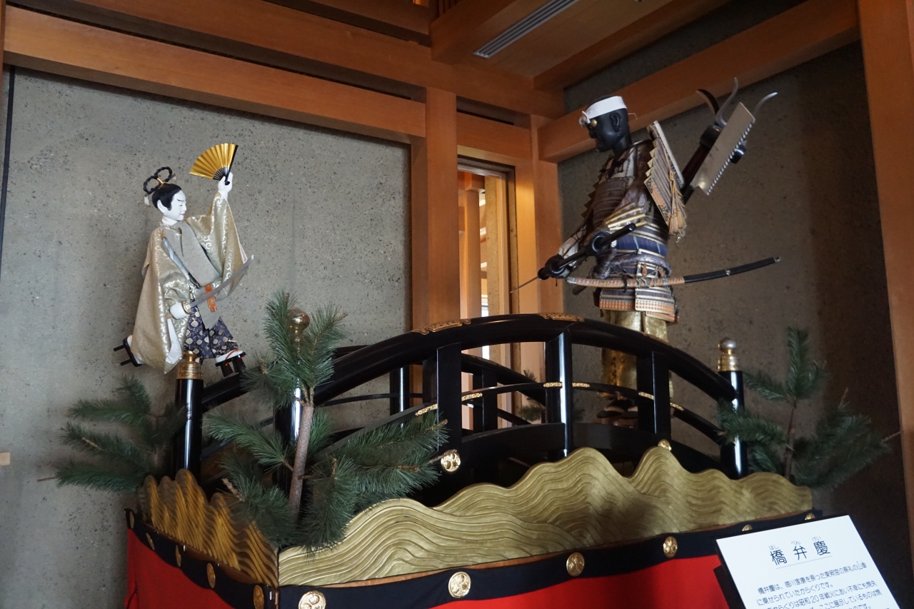 名古屋能楽堂は、名古屋城正門のはす向かい。玄関ロビーにはいきなり橋弁慶の人形があったり、奥の広い通路を使って、演じられた能関係のパネル展示があって、それを見ているだけでちょっと別世界に迷い込んだような感じ。ここは能を見なくても、十分楽しめる施設です。
