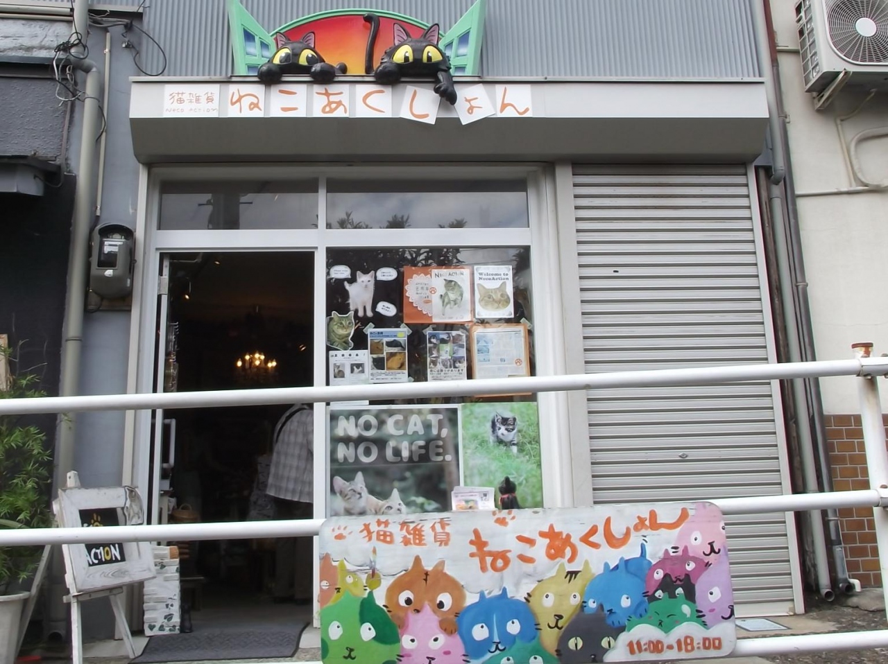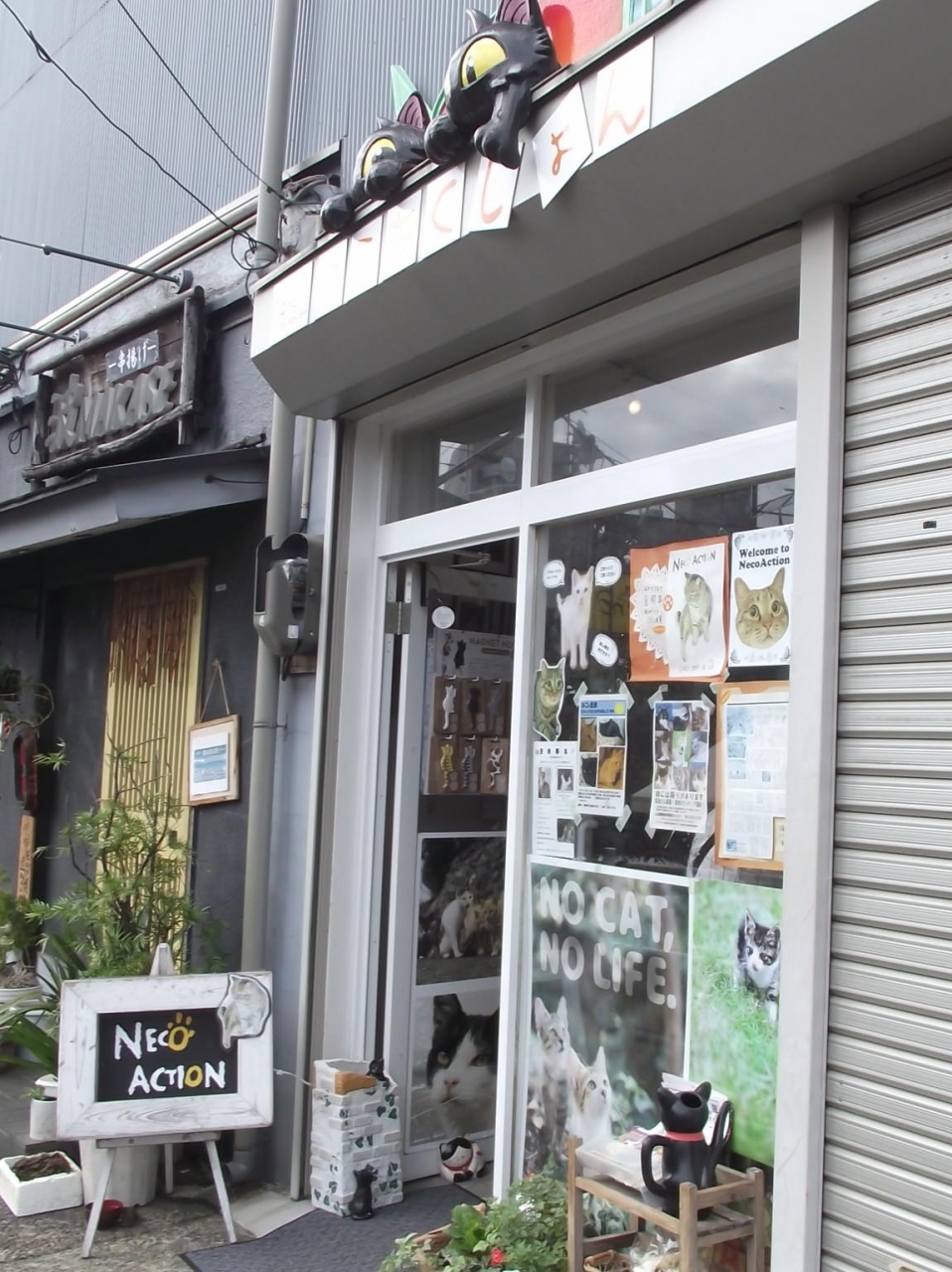 谷中ぎんざ商店街の出入口にあるこの界隈に多い猫グッツ屋さんで、猫の里親探しもしている珍しい店舗です。