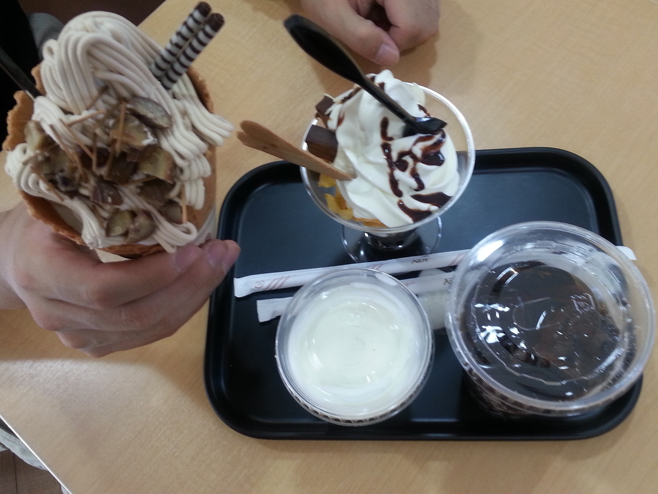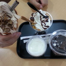 マザー牧場に行った際、こちらで16時頃休憩をしました。こぶたのレースを見た後、席に座ってゆっくり休憩したいと思い、テーブル席のあるこちらのカフェに来ました。レジには長い列が出来ていたけれど、店内の席は空いていて、注文した後、ゆっくり過ごすことが出来ました。私は「焼栗モンブランソフト¥580」を、家族は「生チョコパフェ¥500」「アイスミルク¥200」「コーラ¥210」などをいただきました。栗好きの私には、パフェのように豪華な焼栗モンブランソフトは最高のソフトクリームでした。軽食なども揃っていました。