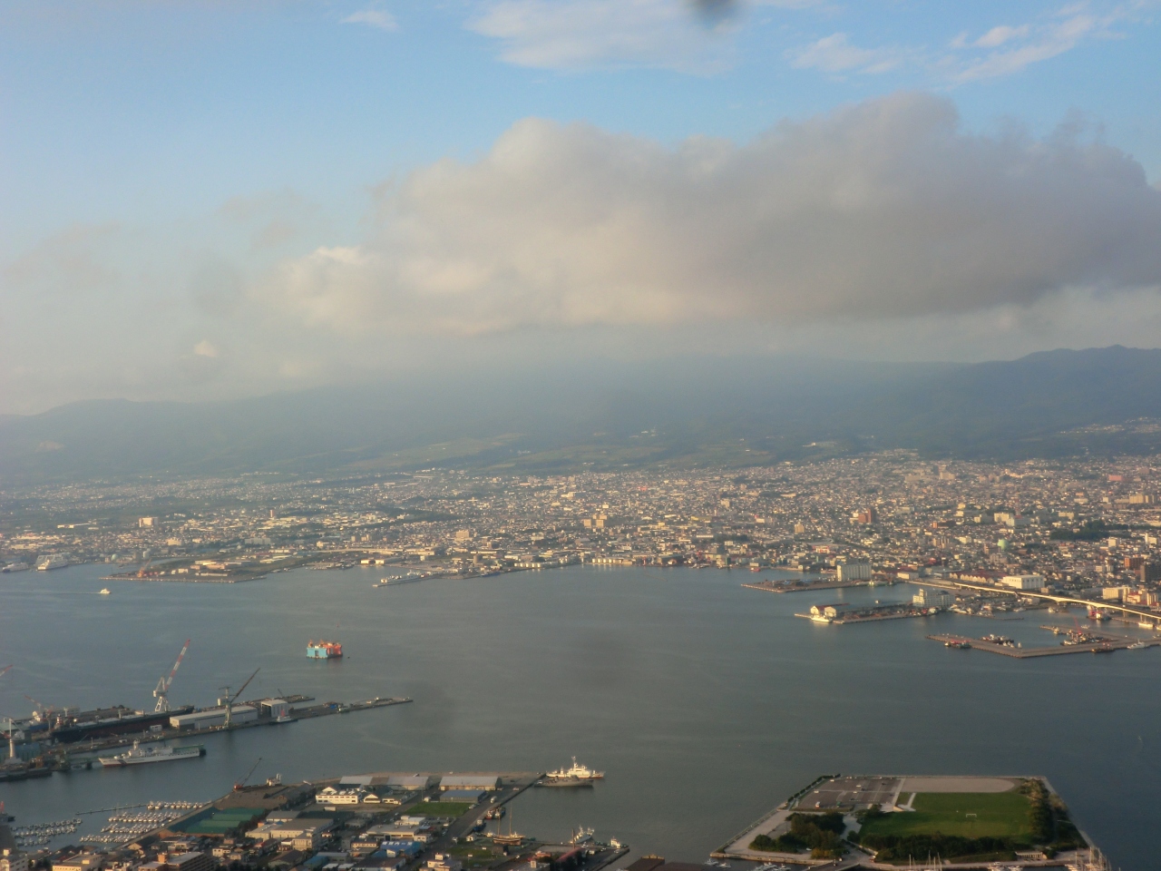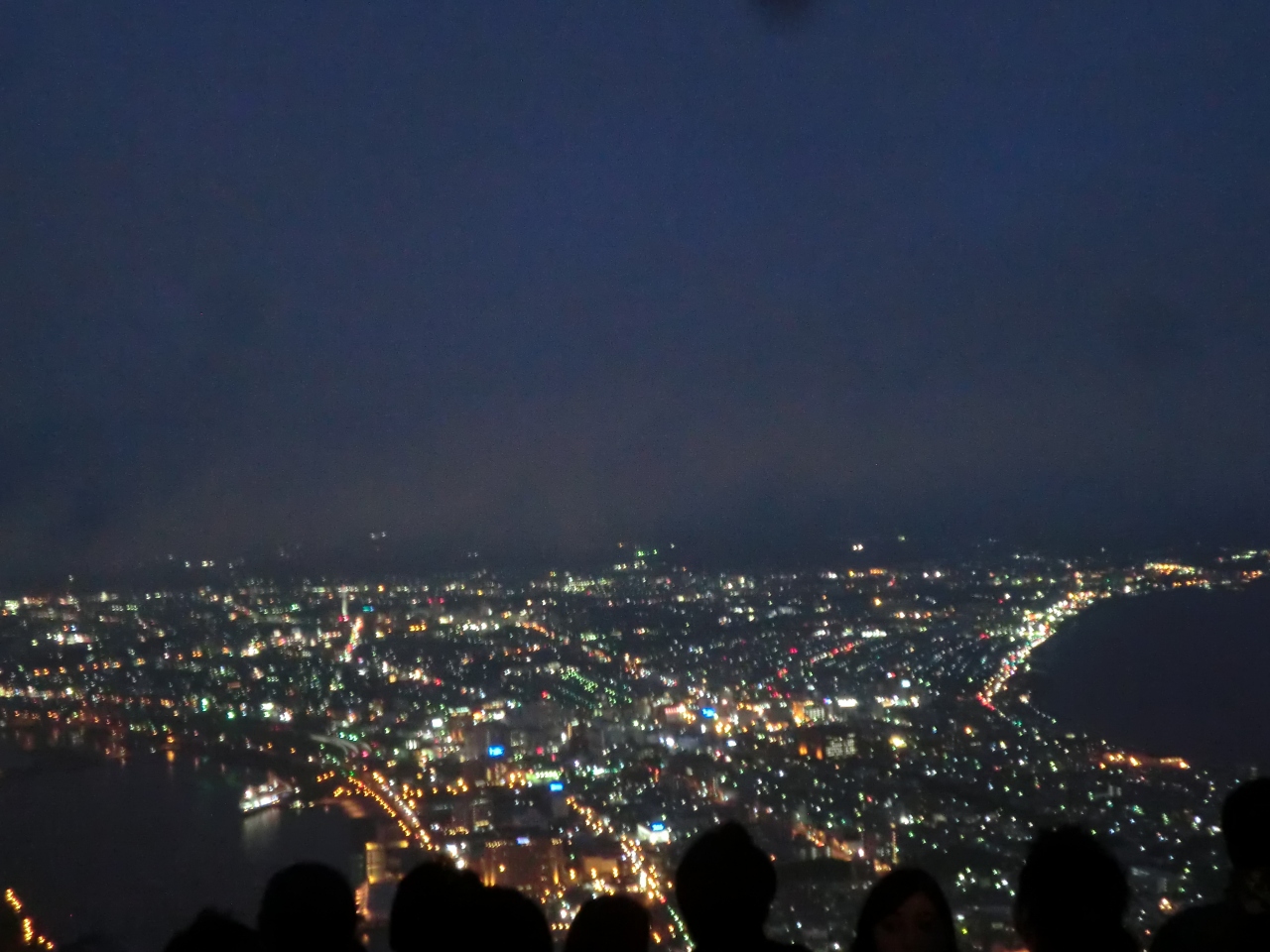 夕刻早めにロープウエイで山頂へ行きました。3分で山頂です。夕日の時刻から、日没まで2時間近く山頂におりました。函館湾、津軽湾、とてもきれいでした。最初はのんびりビールを片手に、函館湾を眺めていたのですが、日没近くなると、人が大勢で、展望台は3重・4重の見学者です。中国人もたくさんいて、当日の函館の観光客が全員ここに集まっているのではと思いたくなりました。肝心の夜景ですが、いいですね。当日は多少ガスがかかっていました。帰りのロープウェイの待ち時間が15分で、これもすごく混んでいました。日没30分前には、山頂に到着しているとよいと思います。ただ、天気次第です。