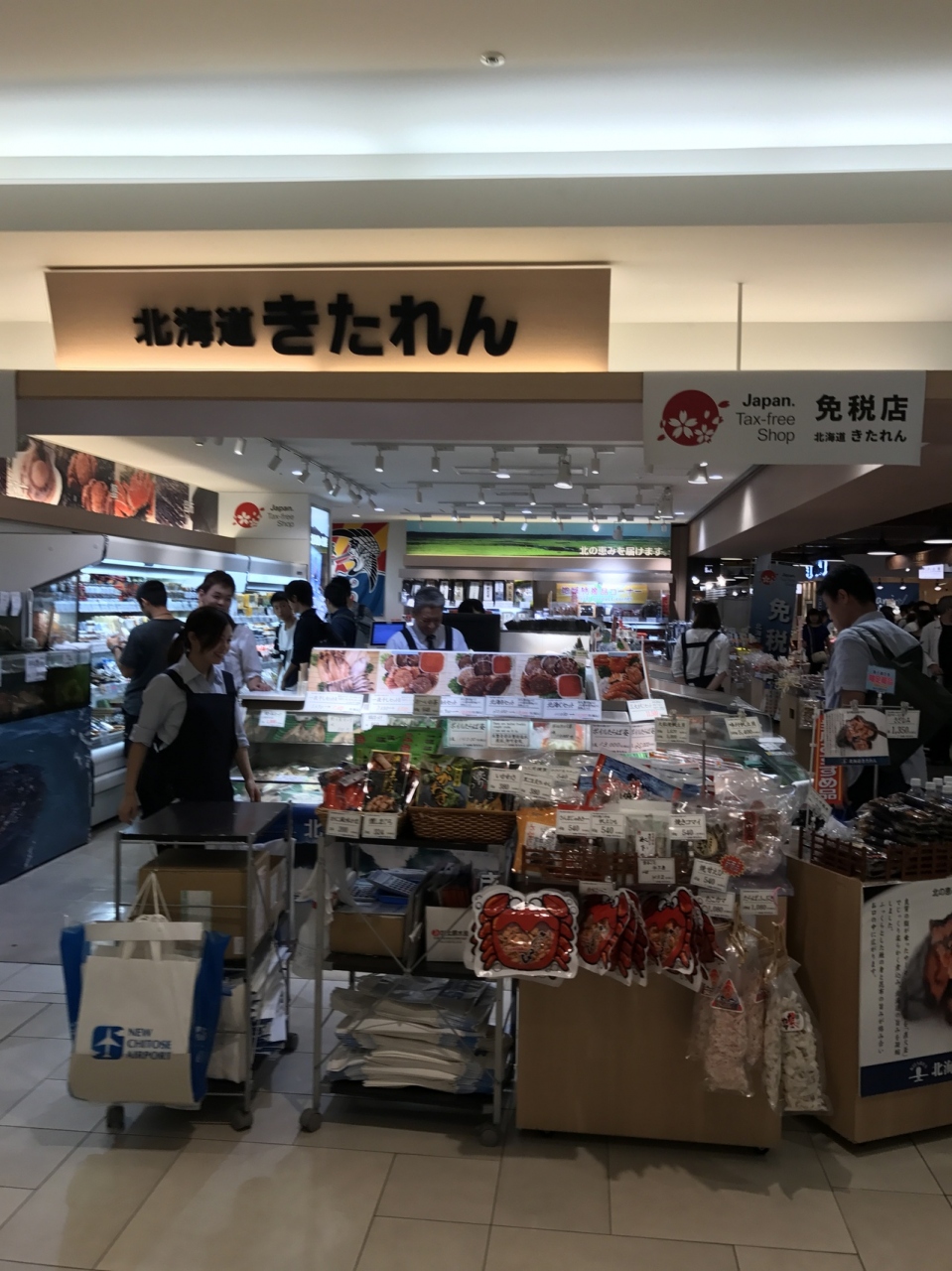 新千歳空港内にありますキタレンは、カニなどの海鮮などのお土産を販売しております。タラバガニは高くて、手が出せないけれども、瓶詰めのいかの塩辛なら、自宅用のお土産にもちょうどよいお値段で良いと思います。