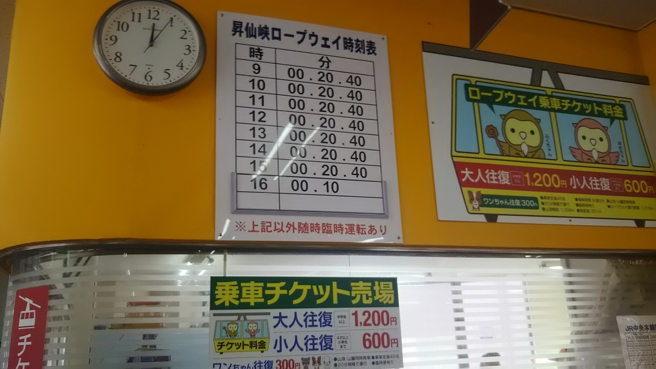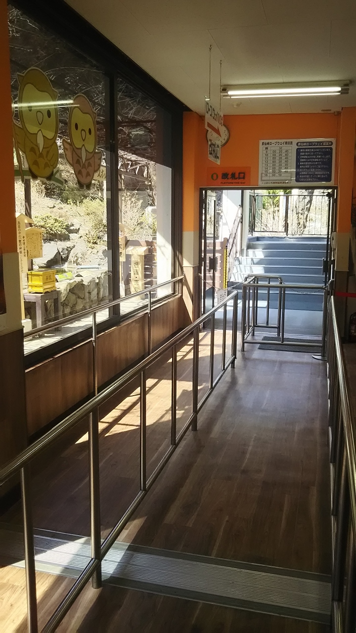 車で行くと、乗り場の前が駐車場でした。平日でしたが春休み中のためか、数人ロープウェイを待つ人もいました。定期的に運行されていて、待つ間はチケット売り場の前がお土産などの展示を見ながら待てます。ロープウェイですので、座る席は少な目。でも、立って窓から景色を見た方が面白いかもしれません。だんだん上に登ると眺めもよっくなり、乗車駅を振り向くと湖が見えました。降りてからは、富士山も遠くに見えました。