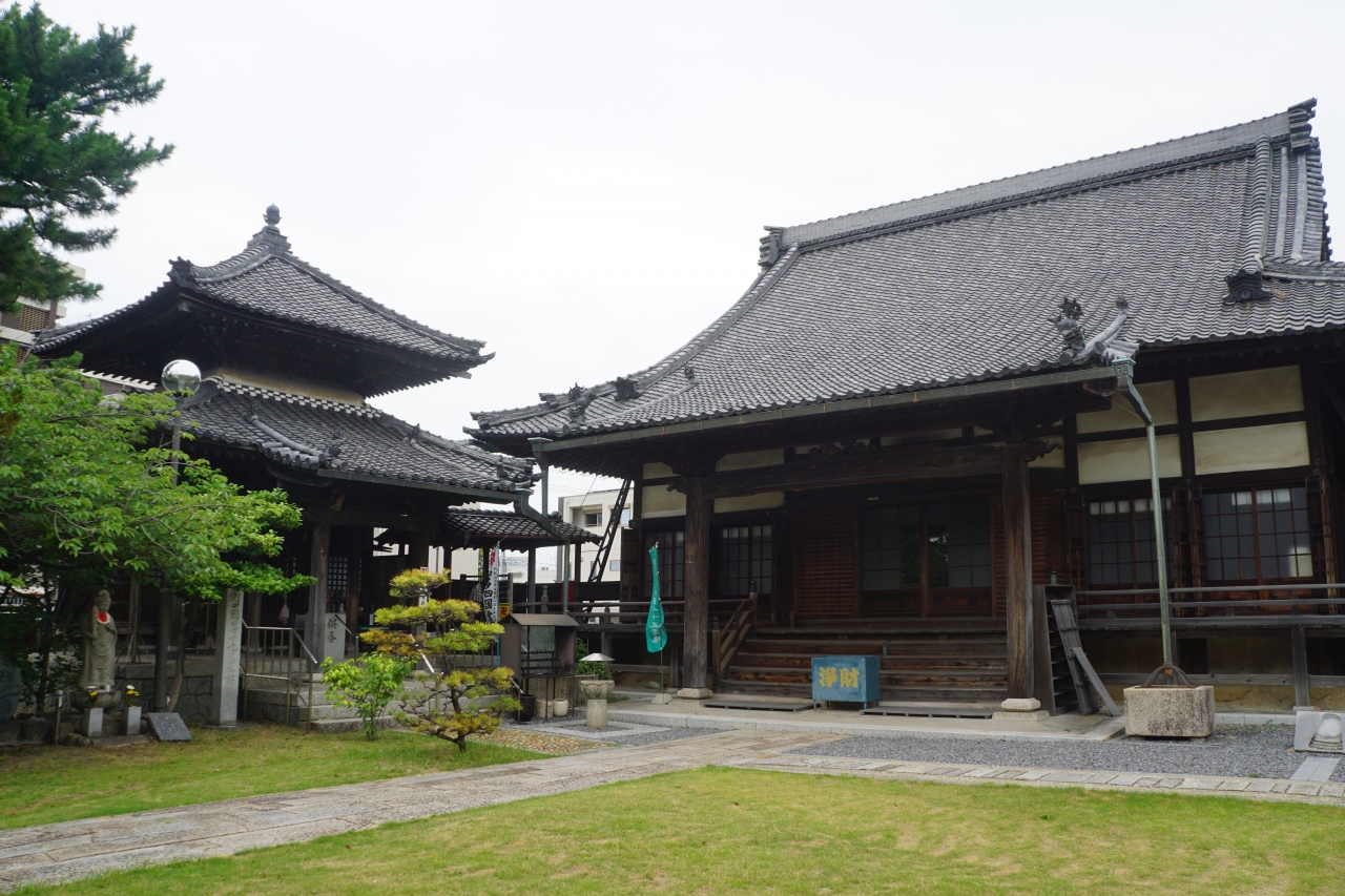 光照寺は、半田市街にある知多四国八十八ヵ所巡礼第十九番の寺。堂々とした薬医門から境内に入ると古びた本堂に芝生の組み合わせ。あとは、本堂の左わきに大師堂が建っているくらいで、シンプル。札所としてのほどよい落ち着きがあると思います。