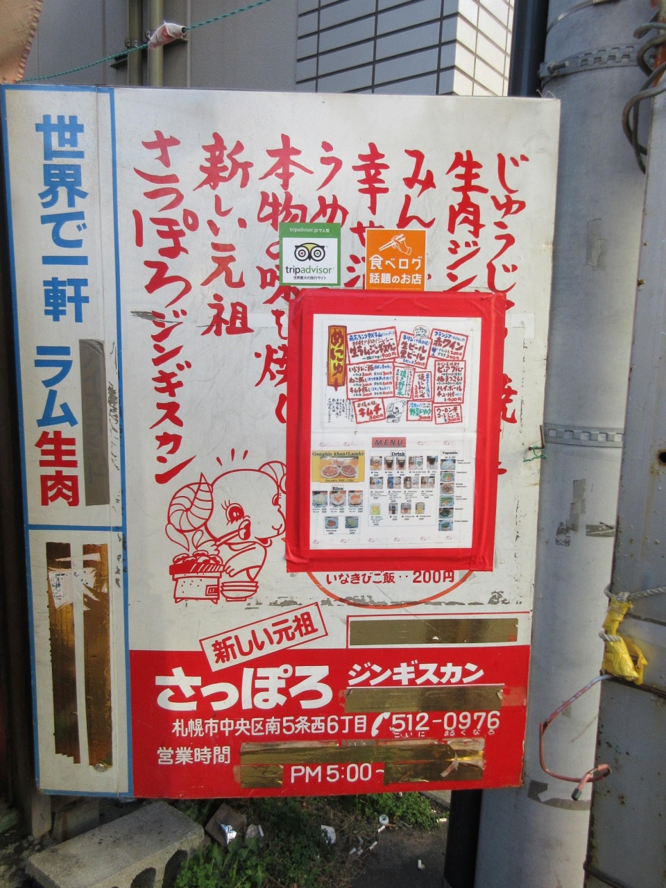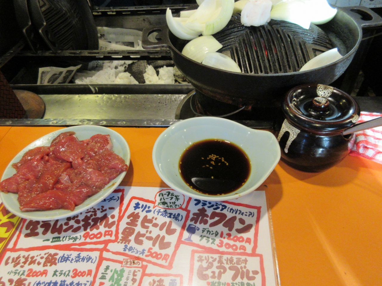 ・「さっぽろでジンギスカンと言えば先ずここ」と教えて貰ったので,午後5時の開店15分前に行きましたが,平日で既に10人程度並んでいました.プレハブのような建物で,「松田つり具」という看板の方がはるかに大きく見えます.メニューはほぼジンギスカン(900円)なので,「おかわり」と言えば,お皿に肉を盛って出してくれます.その他に野菜やキムチのメニューもありましたが・・・.この日は着席と同時に満席で,後から来た人は,椅子の後ろに置いてある長いすなどで気長に順番を待っていました.流石有名店だけあって肉に臭みは全くなく,美味しく食べられました.お肉2皿,ビール2杯,キムチで3,500円くらいでした.なお,「本店」という名前ですが,このお店自体の「支店」は出していないようでした.