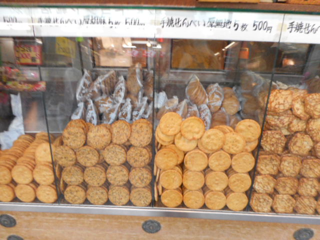 雷門を抜けて仲見世を歩いて、有名店で食べ歩きをしていました。このお店は浅草寺に近いあたりにある人形焼きとおせんべいの有名なお店です。人形焼きはここに来る前にGETしてしまっていたので(手作りでおいしそうだったけど)、ここではおせんべいを。国産のお米としょうゆを使っているおせんべいは、固めでしっかりした味でした。
