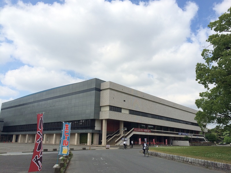 愛知県体育館は名古屋城と同じ敷地内にあり、名古屋城観光に行った際に外から見学しました。